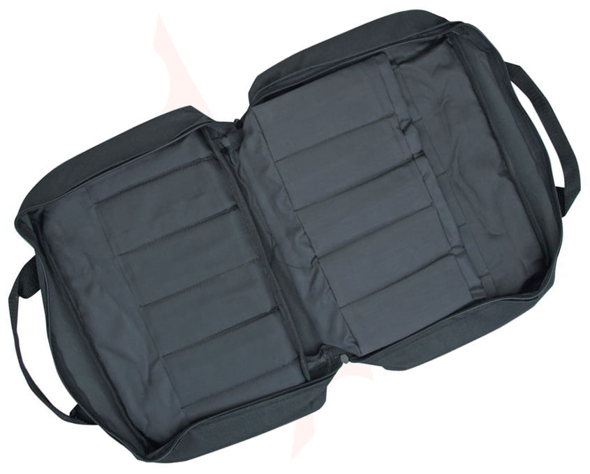 Padded heavy black Cordura construction with durable black nylon handle. Nylon zipper. Two exterior pocket compartments with Velcro closure. Measures 15.5" x 10.25" x 3.5". Holds 22 Knives. Perfect for storage, travel or display. Made in China.