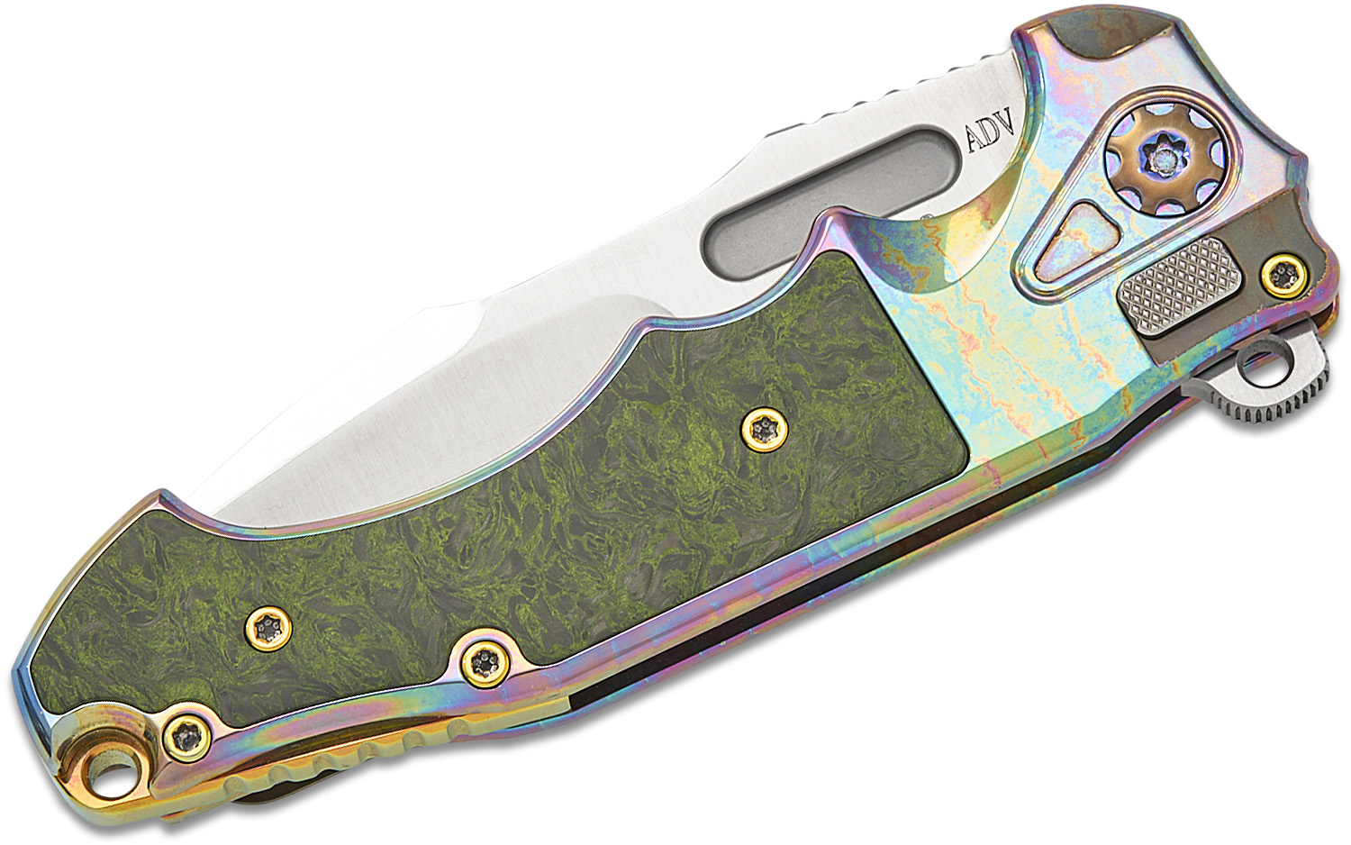 Andre De Villiers Knives Mini Pitboss 3 Flipper Knife 3.625" S35VN Satin Compound Drop Point Blade, Iridescent Acid Rain Titanium Handles with Green Carbon Fiber Inlays, Button Lock