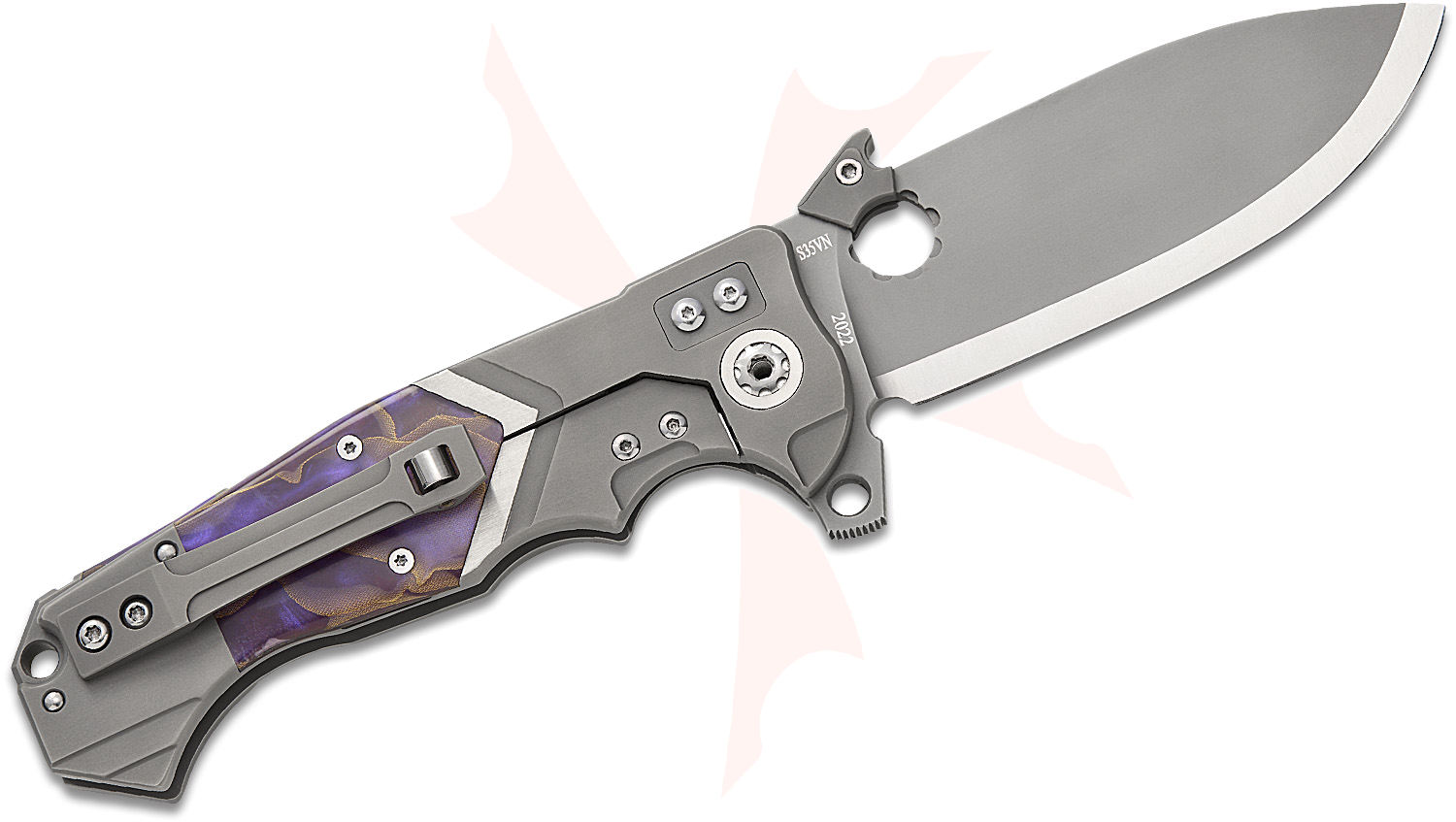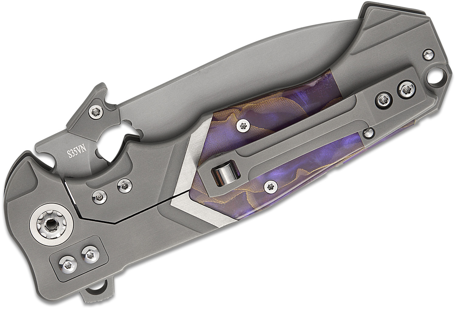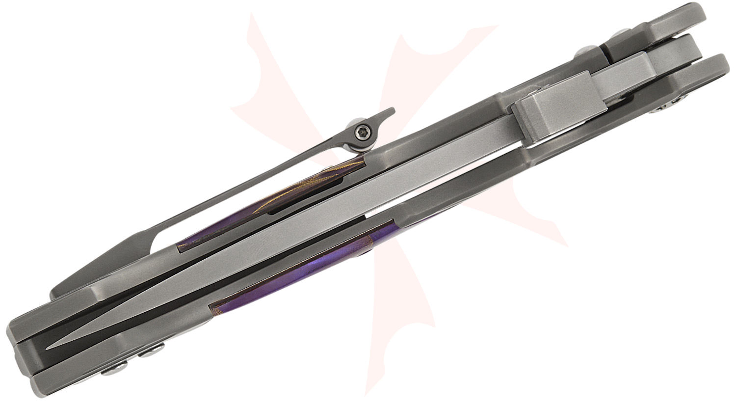 - Handle Material: Blasted V-Milled Titanium with Purple Raffir Noble Inlays