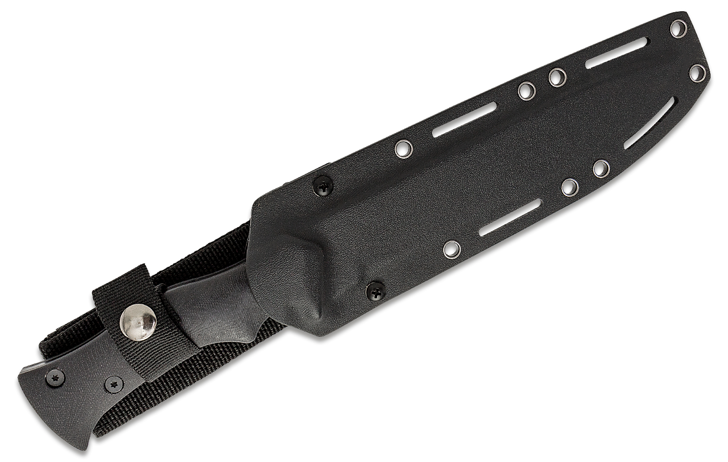 The 6.625" black oxide-coated blade features a finger notch that allows you to choke up on your grip for more intricate cuts and carving duties. The sloping handle with milled black G10 scales and 0.20" blade thickness provides for a secure grip during thrusting, chopping or slicing motions. In those tactical moments that require stealth, you can slip the knife from the Kydex sheath with a gentle snap of the button. Being MOLLE compatible you can place this knife wherever you find it to be most convenient to access.