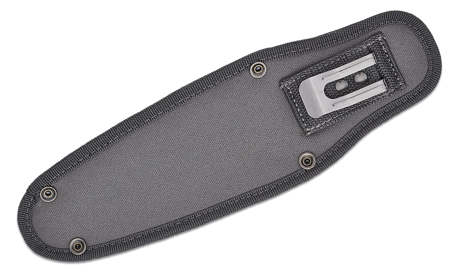 This tool sheath measures 11.5" x 3.5" x 2.5". Constructed from gray waxed canvas and brown leather, it is equipped with a belt clip for easy carrying and a copper finish snap closure. Designed specifically for the Ultimate Hori Hori models (BARE047, BARE056, and BARE078), it is not compatible with the Classic Hori Hori (BARE046). Made in Taiwan.