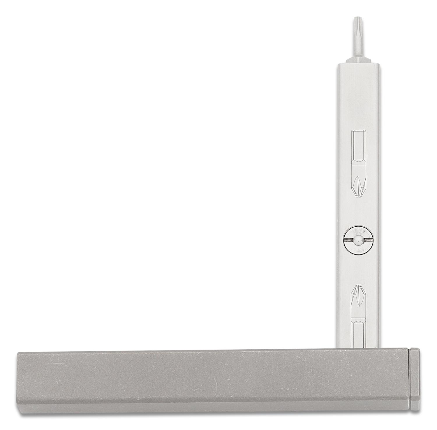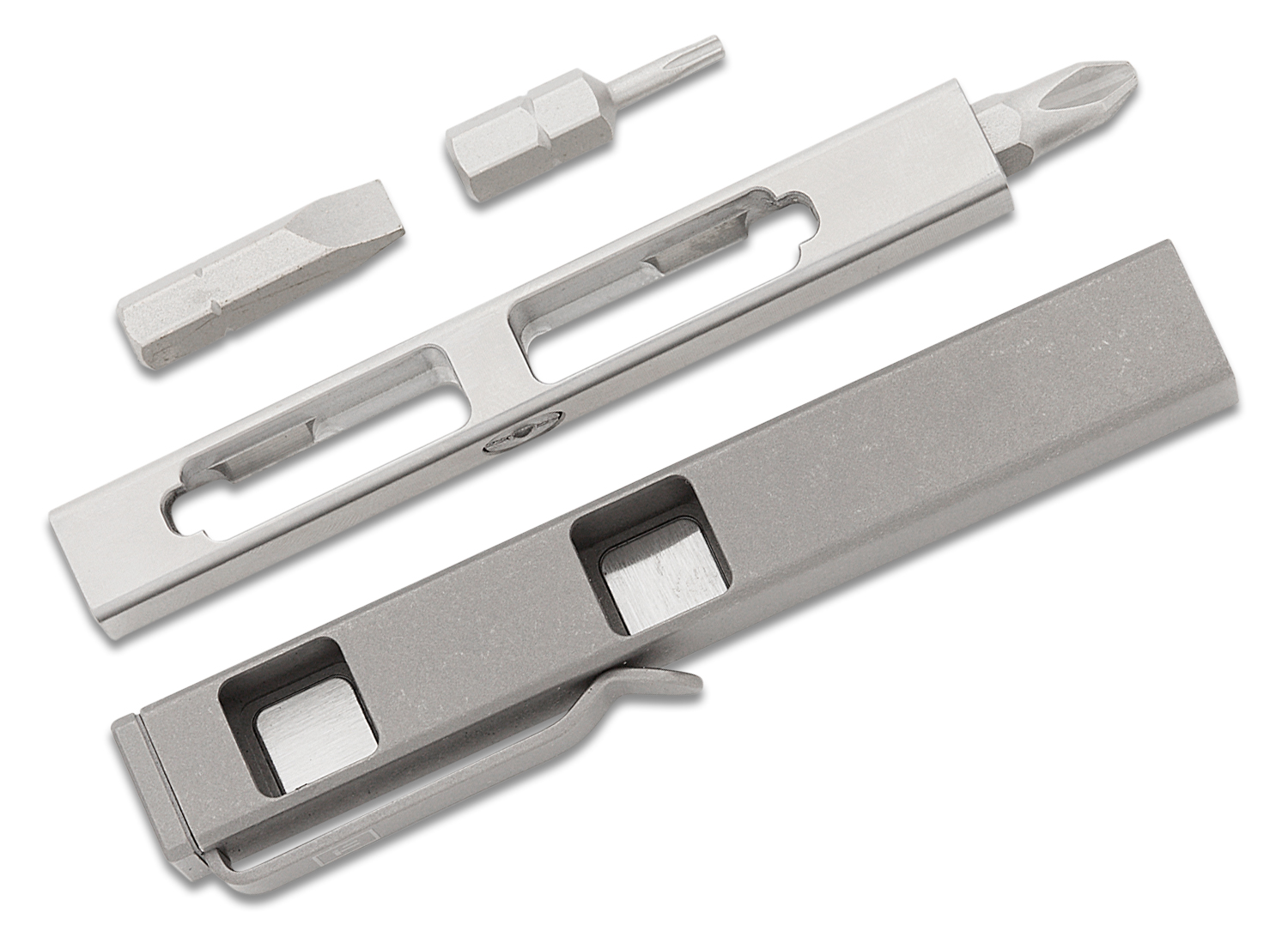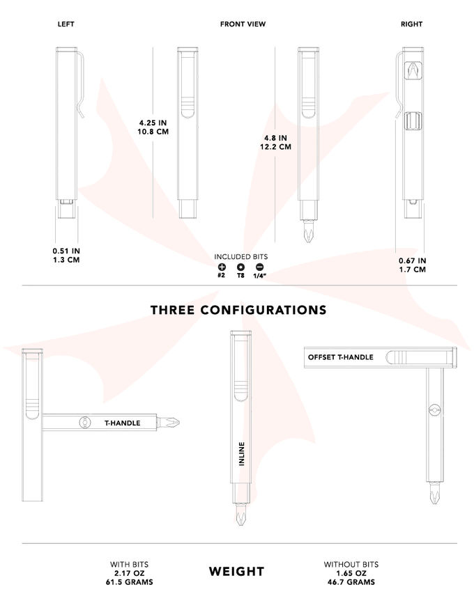 This is a fully custom-designed solid titanium screwdriver with 3 useful configurations + hex bit storage for what you use most. It's a straightforward, no-fuss, and all-function tool that gets the job done and sits comfortably in your pocket. No proprietary bits, it uses the bits you already own. We know you already own a bazillion standard 1/4" hex bits and your perfect 3 bits to EDC are different from ours. So feel free to swap them out/customize the 3 hex bits with the ones you own and build your ultimate pocket screwdriver.