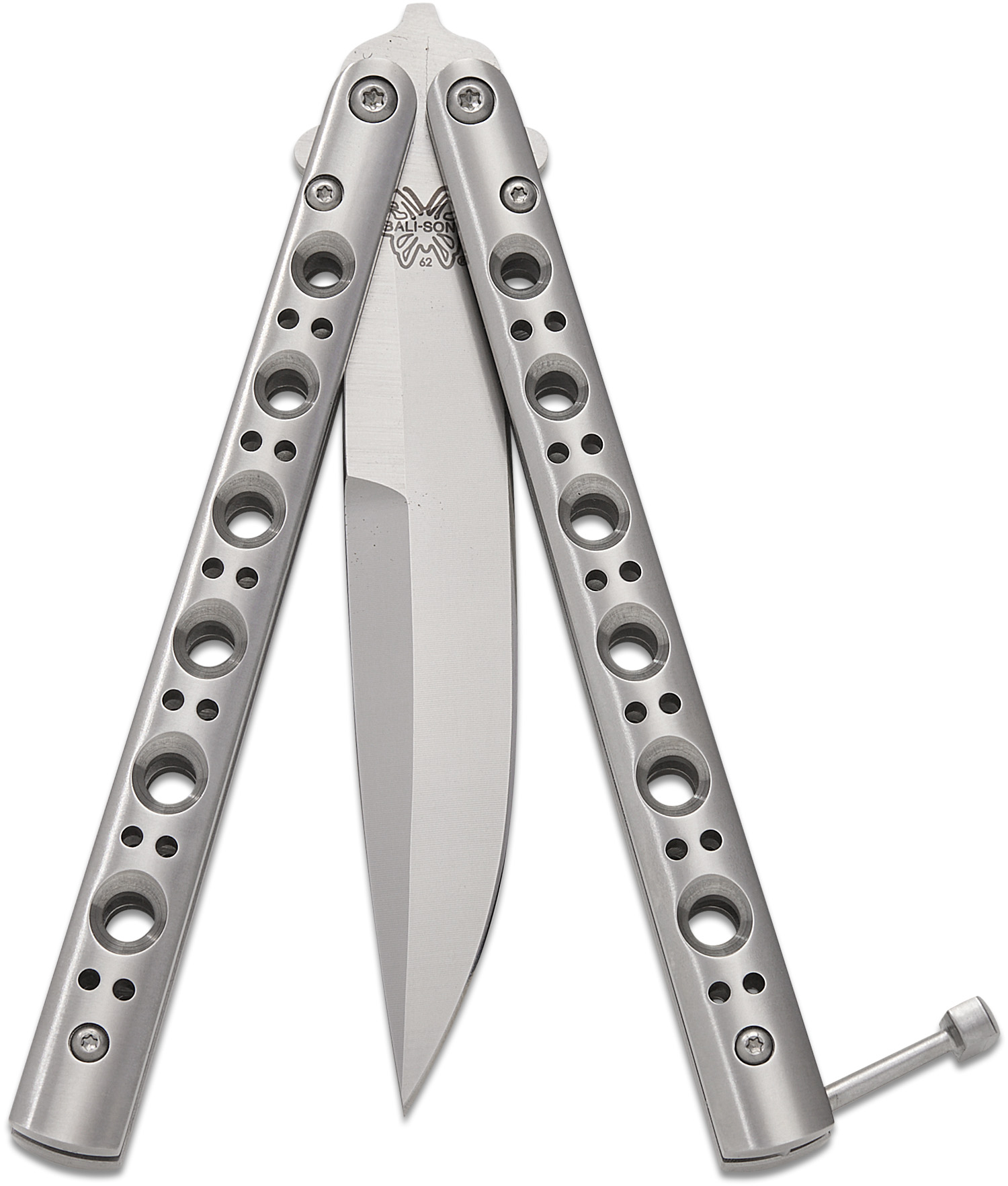 The best is born of history and tradition or as is the case with the Benchmade 62 Bali-Song, reborn. For us, the best began with the Bali-Song, the butterfly knife awesome in its simplicity, the ultimate example of form following function. And now we retrace those steps with the Model 62 with its numerous appreciable improvements. For starters, the Wee-hawk style blade is secured to the handles with screw-head pivot-pins, making the possibility of changing out blades a reality, and the pins are heat-treated and larger than previous ones. The handle latch uses a torx-head pivot-pin attachment as well, so it may be removed if preferred. Another nice feature is the skeletonized cast stainless steel handles which are very tough and weighted for better balance. The handles feature a T-latch lock with more pronounced contour for improved grip. As for the blade itself, we've extended the false edge farther back up the blade as was done on the traditional Wee-hawk designs. So if you're already a Bali-Song fan from way back, you'll definitely be pleased with the Model 62. Or if you're just looking for the ultimate in basic form and simple function-this is it.