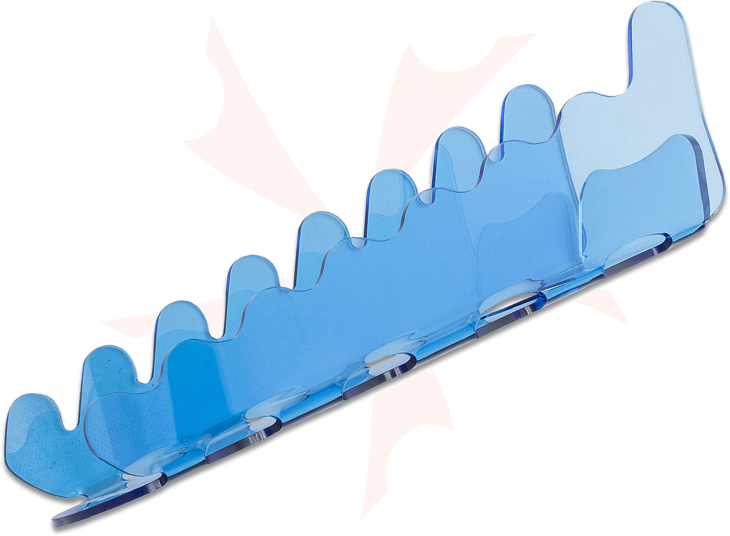 7 piece knife display (knives not included). Blue plexi, white Benchmade textmark logo.
