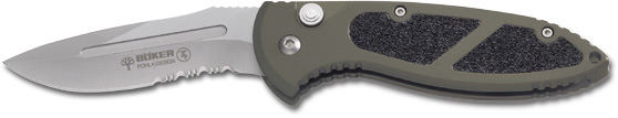 A step further in the evolution. Progress does not mean lean back in your success. Boker always tries to develop, to make good knives even better. The result is the T4, that convinces with many innovative features. The functional design was made perfect by our engineers - lightweight CNC machined AlMg3 aluminum and anti-slip reptile grip insets guarantee a secure grip in every maneuver. Because of the new construction with the open back of the handle, you can easily clean the knife without the need of disassembling the complete system. The newly developed pocket clip gives you convenient accessibility. To optimize the edge-holding ability of the 440C steel blade, it is hollow ground. The blade also includes an additional securing mechanism that blocks the push button. Overall length: 7 7/8". Blade length: 3 3/8". Weight: 4.5 oz.Olive handle and partially serrated blade.