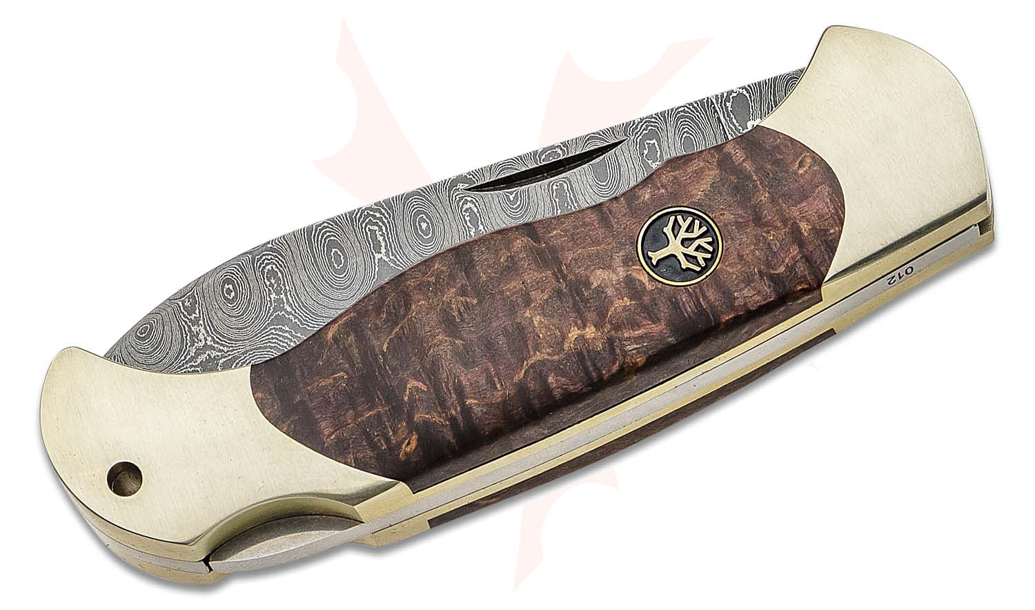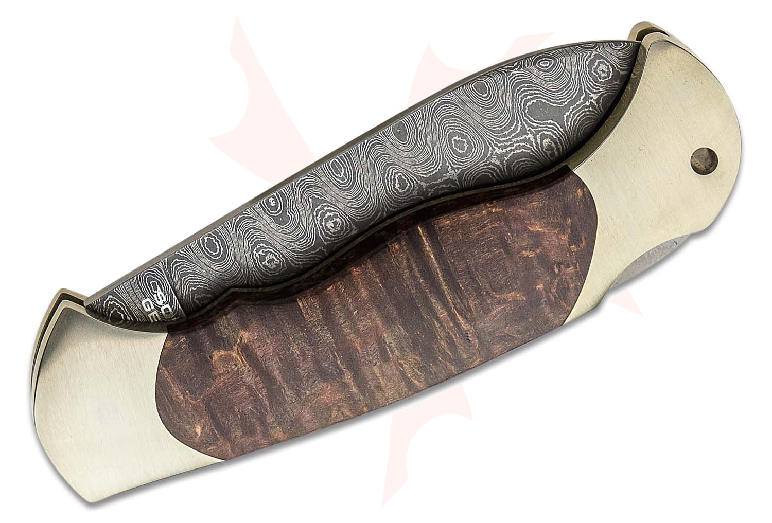 Boker Scout Folding Knife 3.11" Chad Nichols Raindrop Damascus Spear Point Blade, Stabilized Curly Birch Wood Handles, Lockback - 112202DAM