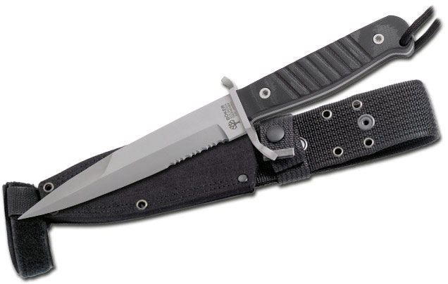 This model features a indestructible micarta handle, a sharp serration on the blade, 440C stainless steel, and a Cordura sheath with plastic insert for added security.