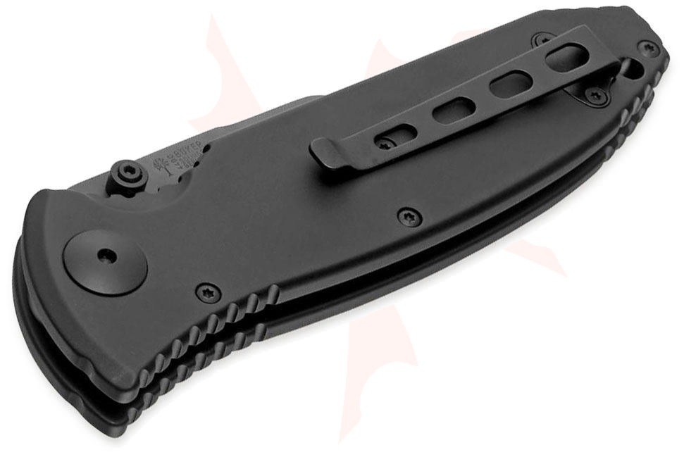 The contour and lines of this Dietmar Pohl design complement the style found in the original Automat Kalashnikov rifle. The finest CNC machine work is incorporated into the anodized 6061-T6 aluminum handles, designed for a firm and secure grip. The blackened 4" blade, reminiscent of the bayonet used with the Automat Kalashnikov 47 rifle, is made of 440C stainless steel. Includes a tip-up pocket clip.