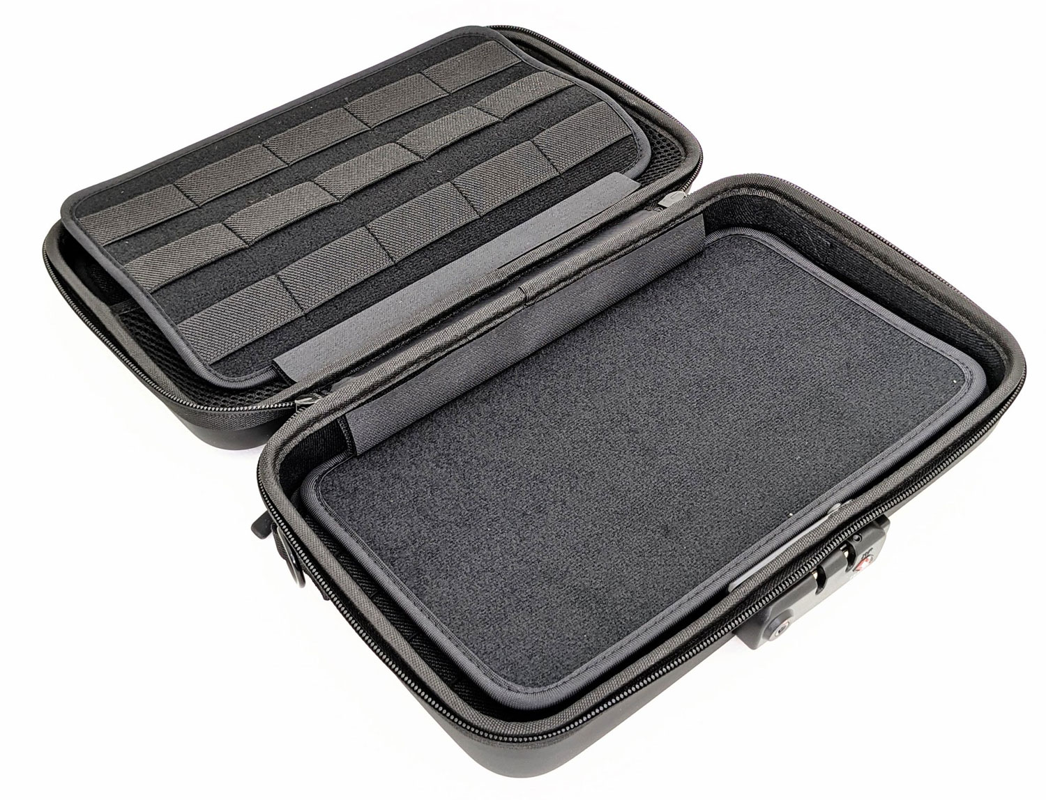 Inside the 11" X 6.5" case, you'll find a system of velcro flex panels you can use to store your items securely. Two Loop Panels, Two Medium Loop Panels, One Large Panel with Loops, and one Large Plaine Mid Panel that serves as a buffer between the top lid and mid-panel. The plain mid-panel also serves as a "Patch Panel" that can hold velcro patches or any graphic with velcro backing.