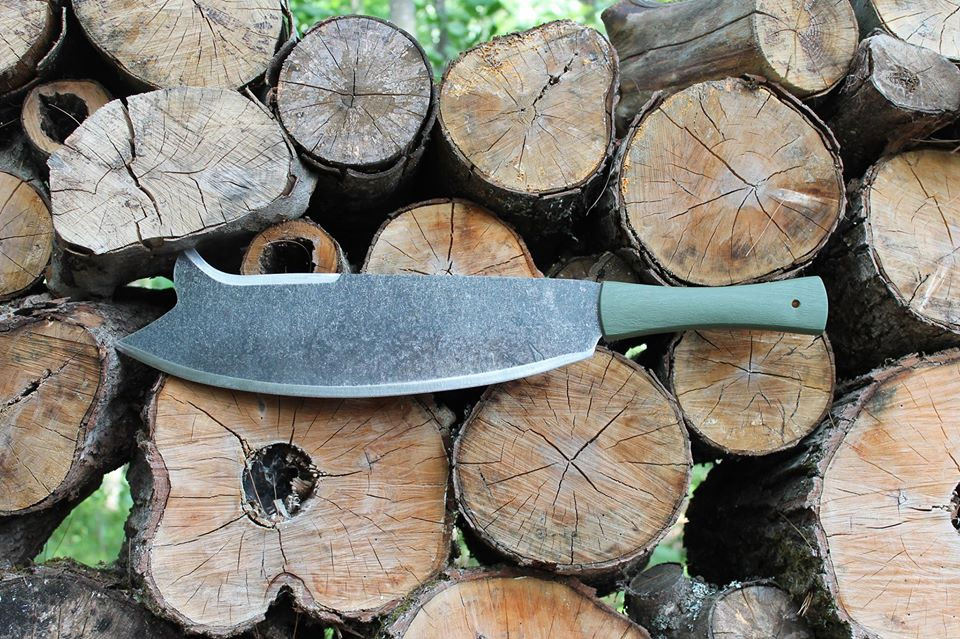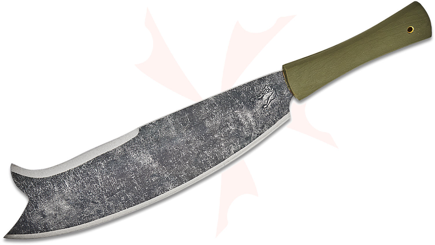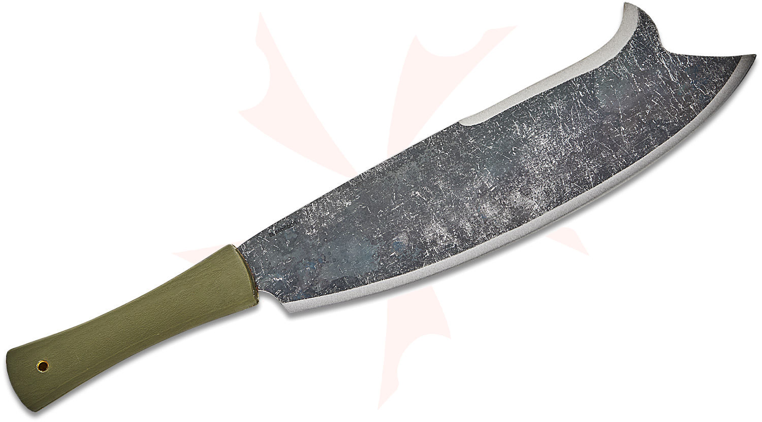 Intended as a versatile do-all, the tool is loaded with features that quickly become apparent in use. The primary edge is used for the bulk of your general chopping tasks and features a continuous curve to the edge for rocking or drawing cuts. The back hook gives a sickle like blade for cutting grasses, brambles, woody stemmed plants and any other target that would be prone towards slipping off the edge of a conventional blade. The bifurcated tip allows for a usable point for detail work, a striking zone for batoning or a handhold for draw/push-knifing, and acts like an extension of the arm for pushing brush out of the way. The symmetrical handle allows either edge to be used in the forward-facing position depending on the needs of the situation and is long enough to be used two-handed if desired. Comes with large lanyard hole to allow you to add one for safer handling and includes a high quality nylon sheath.