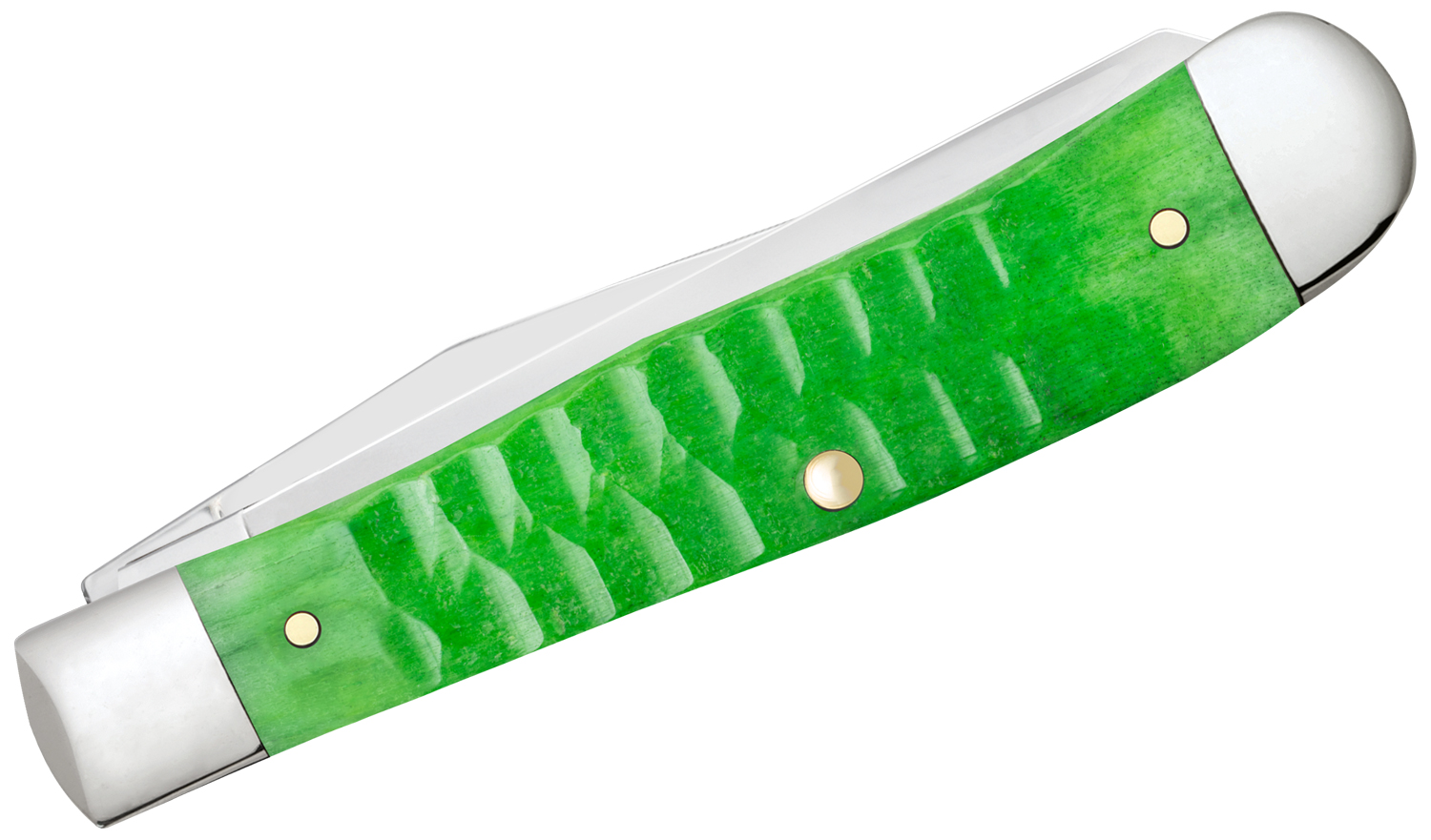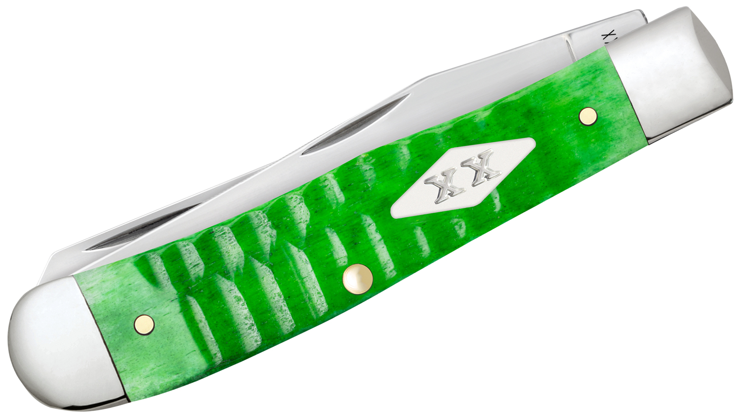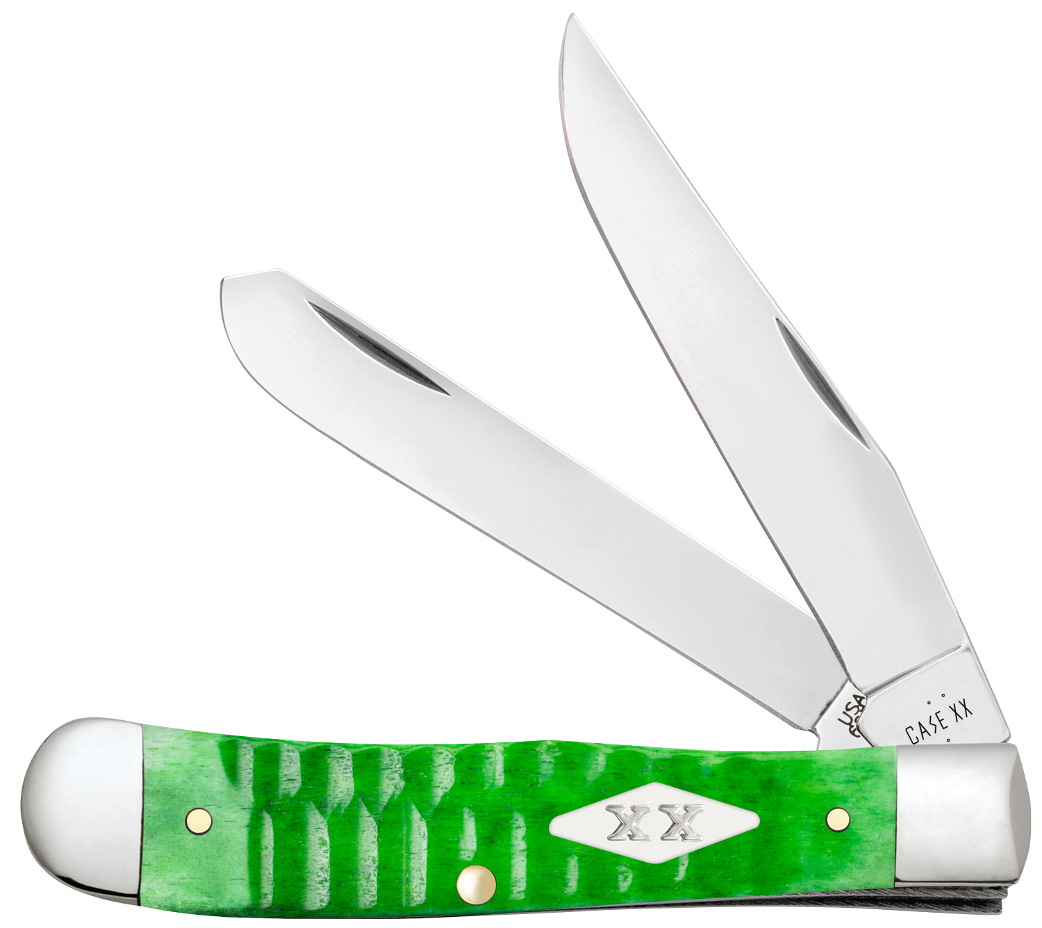 These bright green bone knives have their looks enhanced with a rough Gator jigging that really gives them the look of alligator skin. With Tru-Sharp stainless steel blades and a Case XX diamond shield, this family of pocket knives is an instant classic. The Trapper gets its name from the consumer for whom it was designed. Because of its basic trapping and skinning blades and its light weight, it is a must-have folding knife for those who trap small game. It is a jack knife with two full-length blades, a slender Clip, and a long Spey. The Clip blade is commonly used as a multi-purpose blade and preferred for detail work, while the Spey blade is commonly used as an all-purpose utility blade. This pocket knife is constructed with Case Tru-Sharp stainless steel, which is a special high-carbon steel that helps the blades hold an edge longer than conventional steel. It also offers extraordinary blade strength and corrosion resistance.