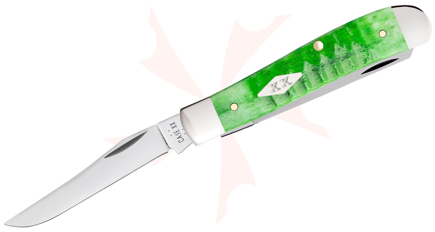 These bright green bone knives have their looks enhanced with a rough Gator jigging that really gives them the look of alligator skin. With Tru-Sharp stainless steel blades and a Case XX diamond shield, this family of pocket knives is an instant classic. Mini Trappers are a smaller version of Case's Trapper, carrying two full-length blades, the Clip blade and the Spey blade. The Clip blade is commonly used as a multi-purpose blade and preferred for detail work. The Spey blade is commonly used as an all-purpose utility blade. The basic trapping and skinning blades make this a must-have knife for those who trap small game. This knife is constructed with Case Tru-Sharp stainless steel, which is a special high-carbon steel that helps the blades hold an edge longer than conventional steel. It also offers extraordinary blade strength and corrosion resistance.