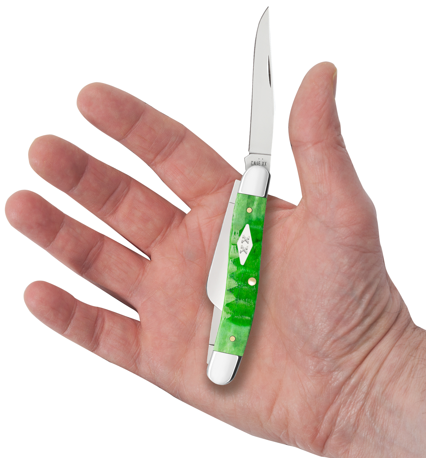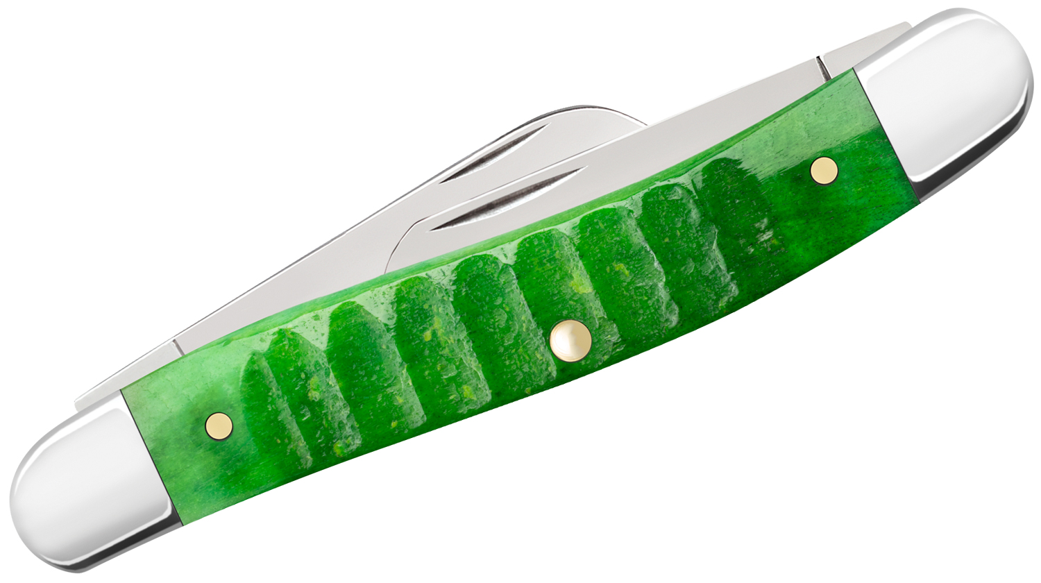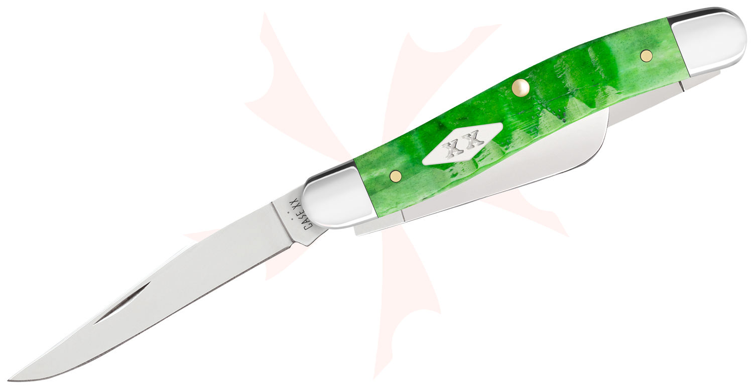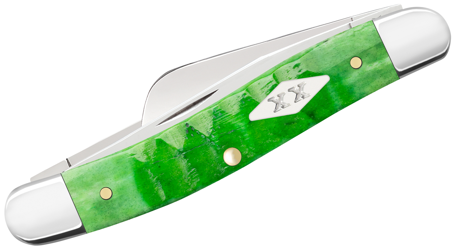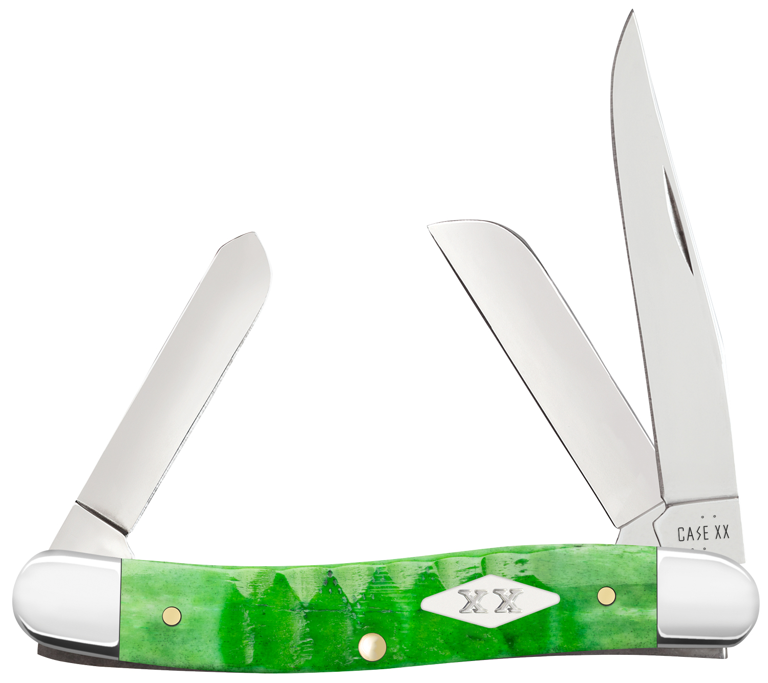 These bright green bone knives have their looks enhanced with a rough Gator jigging that really gives them the look of alligator skin. With Tru-Sharp stainless steel blades and a Case XX diamond shield, this family of pocket knives is an instant classic. Stockman's pack three blades in a convenient but very practical pocket knife. The Clip and Sheepfoot blade sits on the pocket end, while the Spey blade sits on the cap end. The Clip blade is commonly used as a multi-purpose blade and preferred for detail work. The Sheepfoot blade allows for added strength at the point, making it great for carving and achieving a clean cut. The Spey blade is commonly used as an all-purpose utility blade. This knife is constructed with Case Tru-Sharp stainless steel, which is a special high-carbon steel that helps the blades hold an edge longer than conventional steel. It also offers extraordinary blade strength and corrosion resistance.