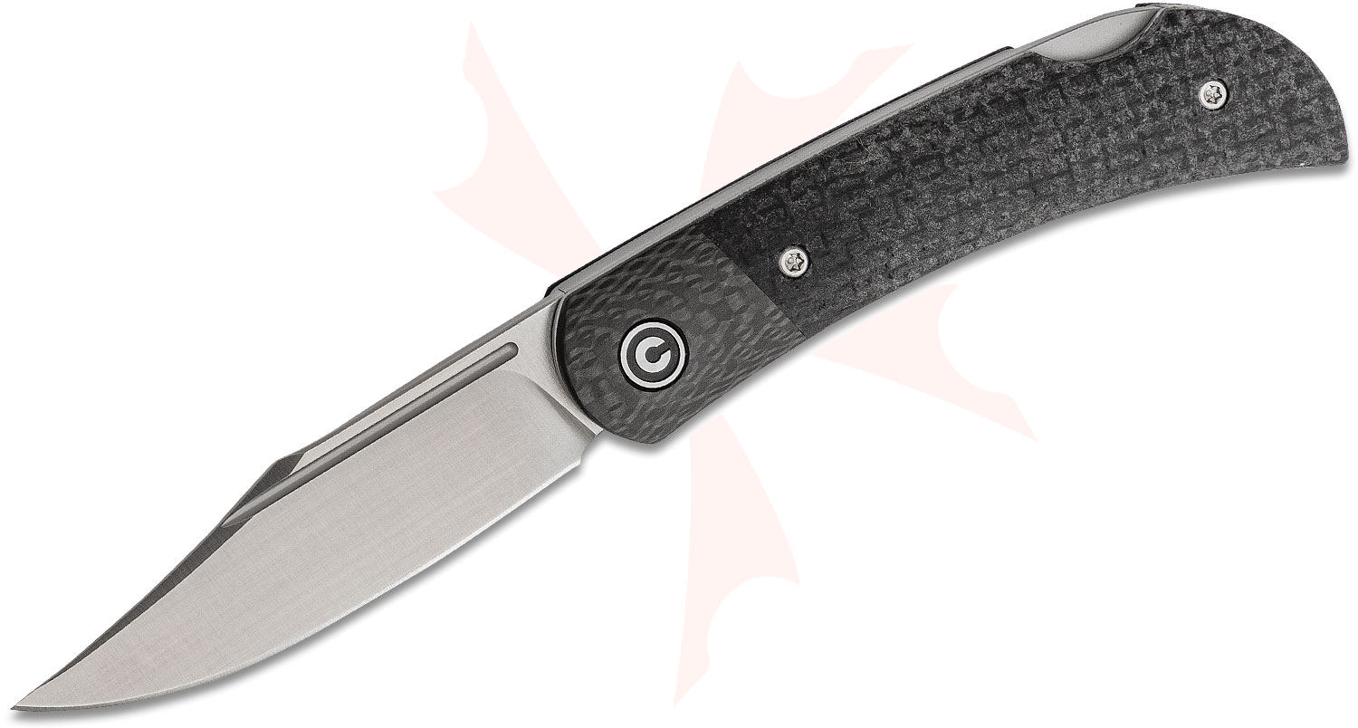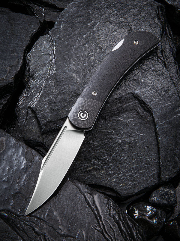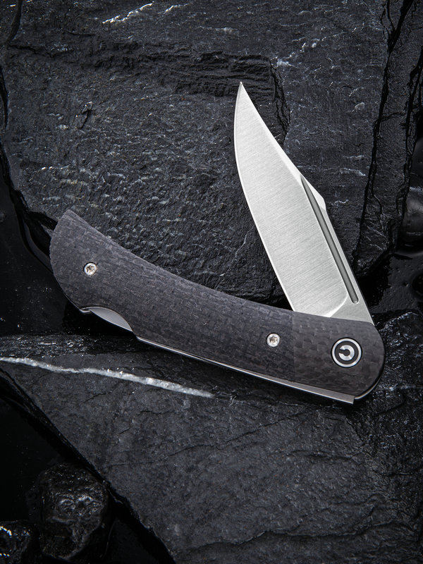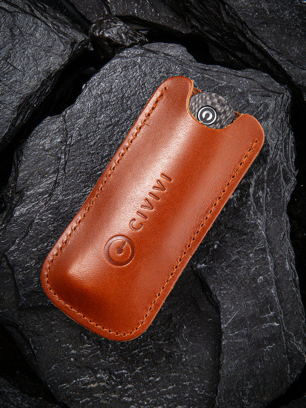 CIVIVI Knives are the kind that you give as a gift to a friend, whether or not they're into knives. Anyone will feel the quality and attention to detail as soon as they pick one up yet their price points will signify that these knives are built to be used. The Rustic Gent is a stylish gentleman's pocket knife with a classic design aesthetic. The 2.97" D2 hollow ground blade has a sweeping belly with an upturned piercing point and a satin finish. The slim, elegantly curved handle is made from a smooth Micarta with carbon fiber bolsters. The blade requires two hands to open, but deploys easily thanks to the bronze washers in the pivot. The knife comes with a natural leather sheath that has a black stainless steel clip allowing it to be carried easily.