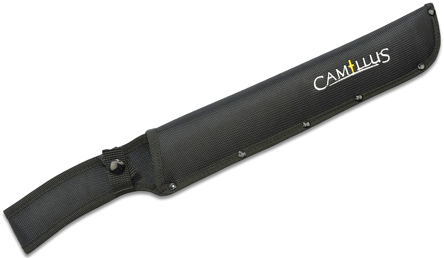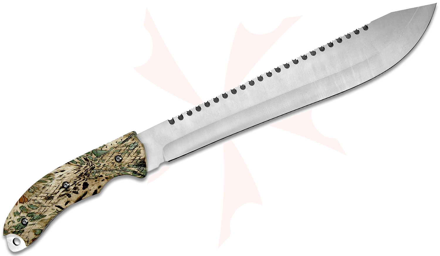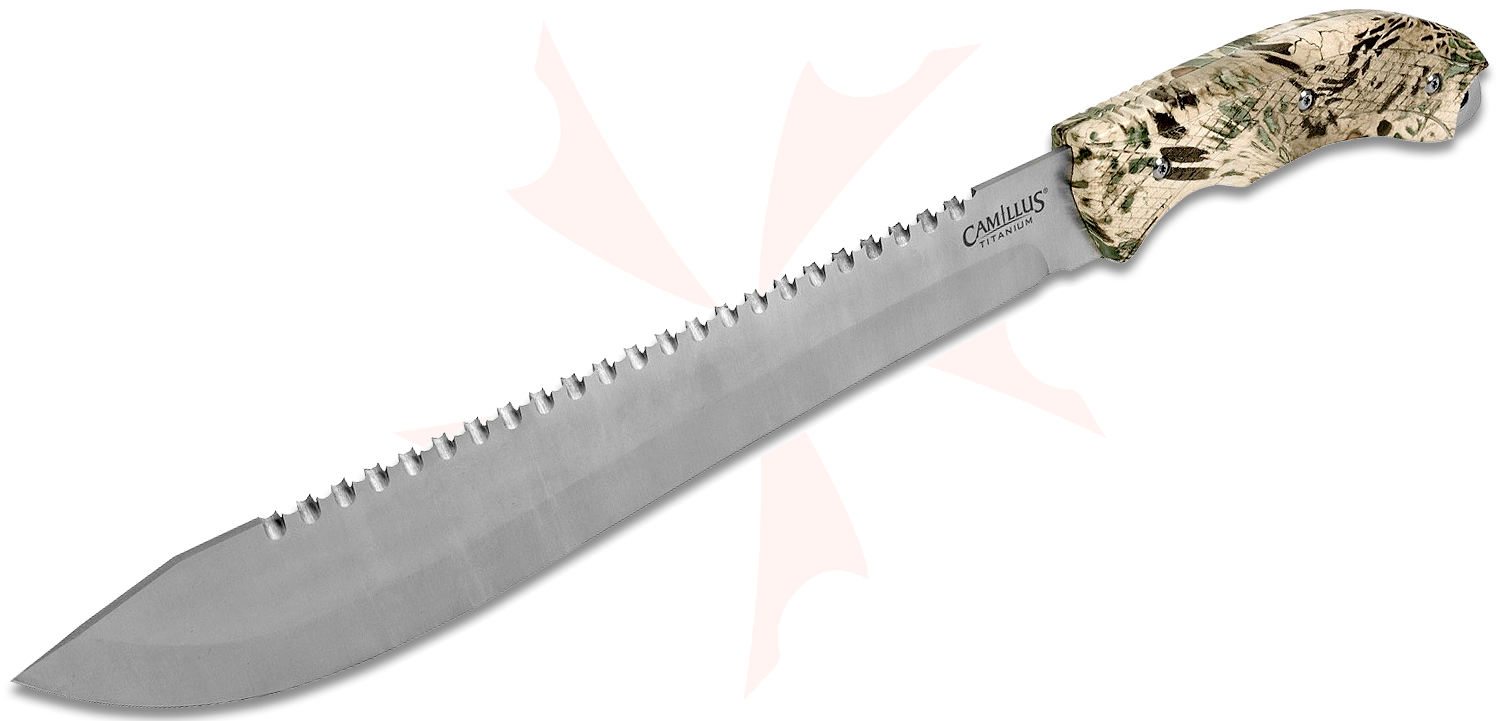The Camillus Hide Machete measures 17" overall and features a 420 stainless steel blade with Prym1 Camo handles. 420 is a hard and strong steel that is commonly used in knife blades and offers good corrosion resistance at a low cost. The steel is bonded with Titanium that resists rust and corrosion and is up to 3x harder than untreated steel so the blade stays sharper, longer. The 12" machete blade has full-length sawback serrations that boast an aggressive quadruple grind for effective sawing. Includes ballistic nylon sheath. Comes with a Lifetime Warranty.