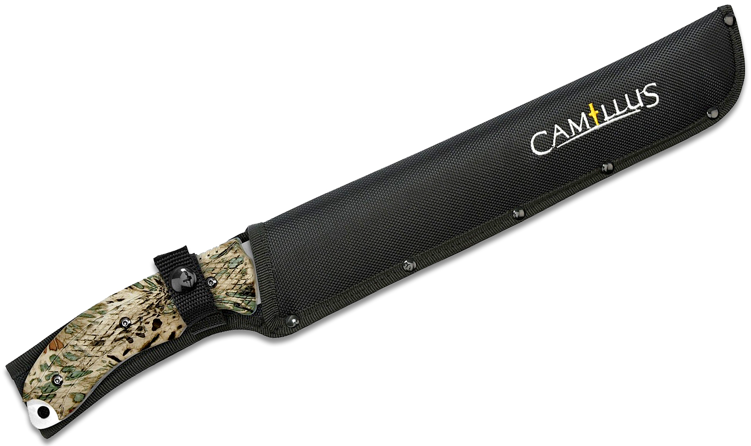 Camillus Hide Machete 12" 420 Stainless Steel Sawback Blade, Prym1 Camo ABS Plastic Handles, Nylon Sheath - 19840