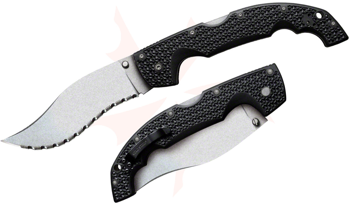 The KnifeCenter considers the Vaquero series of folders from Cold Steel to be among the best knives produced over the last 20 years. The Voyager series in general are well designed and very well made and any Voyager will serve the user well for many years. Materials are all very good and the action and lockups are fast and solid. The Vaquero series, though, is especially suited to very quick slicing or tearing. The serrations are very aggressive and, on the small curves, the blade just about has steel hairs extending out. They are wicked sharp. Admittedly, through repeated use, those hairs will shrink, but these will still be very aggressive cutters. You can dress up the edge by sharpening the flat side of the blade but will eventually have to take a rat-tail file type sharpener into the serration grooves to sharpen it up.