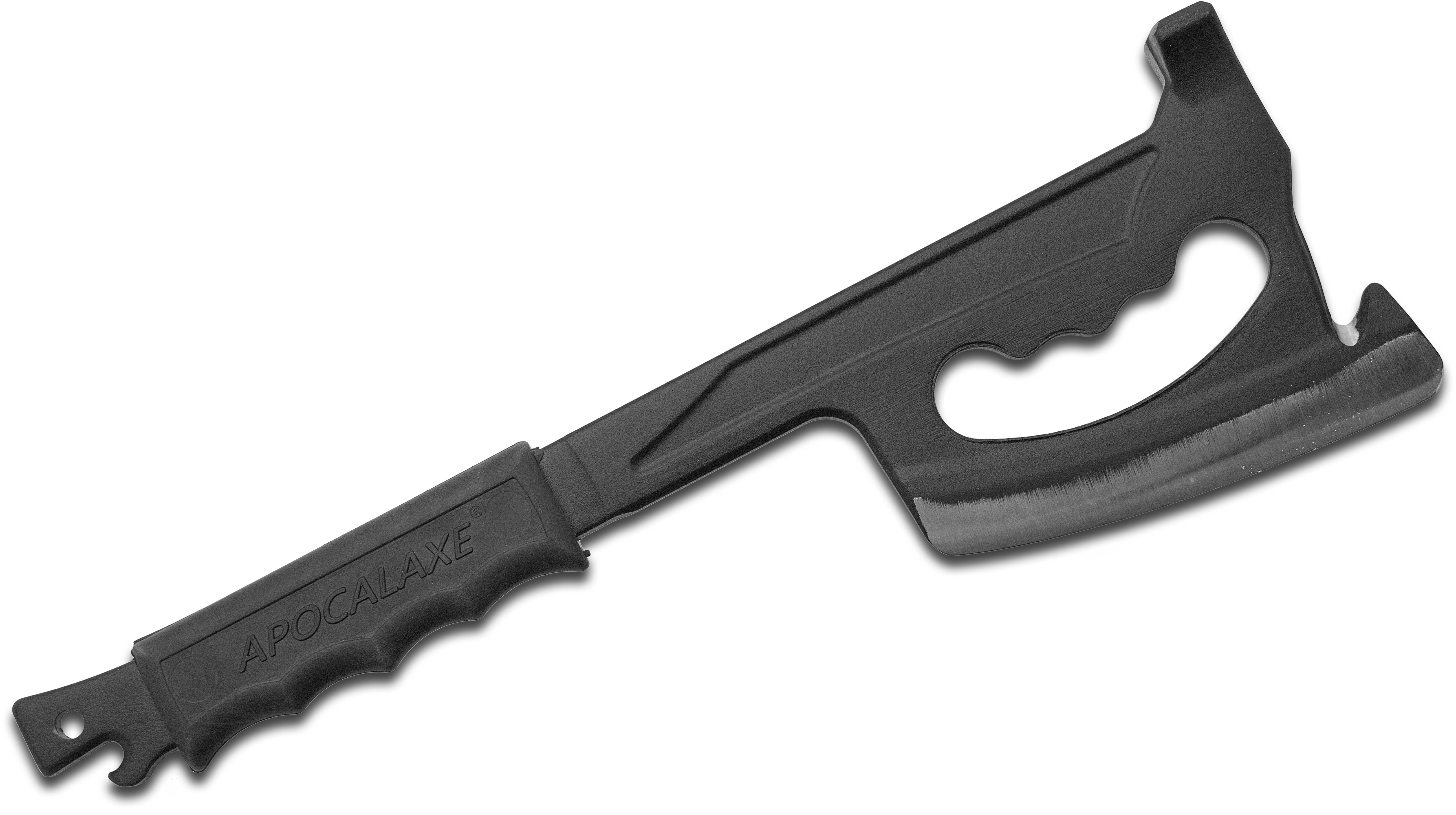The ApocalAxe is a multi-purpose tool featuring a very sharp blade, hammer head, gut hook and can/bottle opener. The black coating provides a durable, non-reflective finish, making it great for tactical use. This tool is also ideal for wilderness outings and general bushcrafting activities. The sharp blade can cut saplings for firewood and has a grip behind the blade great for skinning and detail work. The gut hook is very sharp in just the right place to assure a clean cut before skinning. The hammer head can be used to drive in tent stakes and the polymer hand grip is non-slip and shock absorbing. This is a multi-functional tool for tactical situations, camping, hunting, hiking and general outdoor life. These are proudly made in the USA.