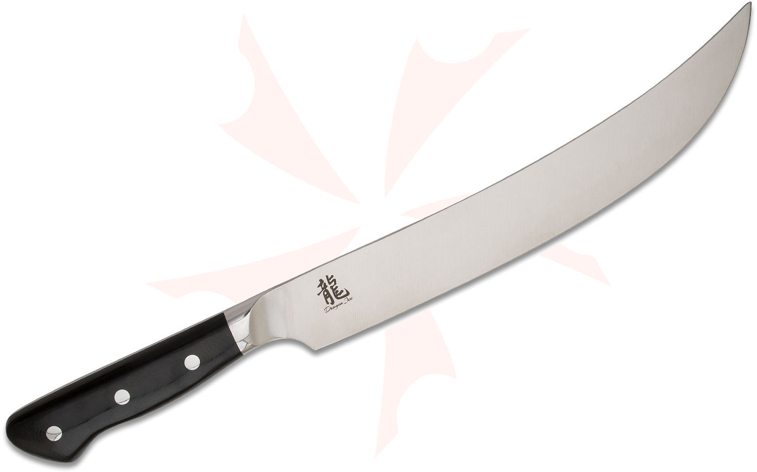 Commonly referred to as a cimeter, or sometimes a butcher knife, the Dragon Ice Scimitar is 10" of meat slicing magnificence. The BD1N stainless steel is forged to make an ultra-sharp and long-lasting edge to cleanly cut through meats for ideal presentation and minimal waste. The curved tip protects itself from getting lodged into bone the way a traditional carving knife would. Despite measuring 10", the blade is comfortable to hold thanks to its full tang construction, angled bolster, and G-10 handle.