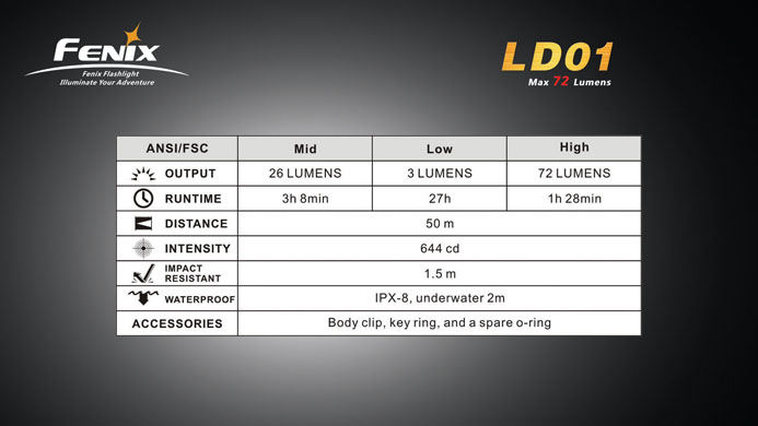 The extremely small Fenix LD01 LED light is not much bigger than the one AAA battery it uses. Its 3 modes allow the user to select the best compromise between brightness and runtime for any given task and to aid in an emergency. The light produced by the Fenix LD01 can be best compared to many flashlights ten times its size.