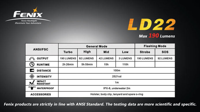 Fenix LD22 (R5) Variable Output LED Flashlight, Strobing, 190 Max Lumens - LD22R5