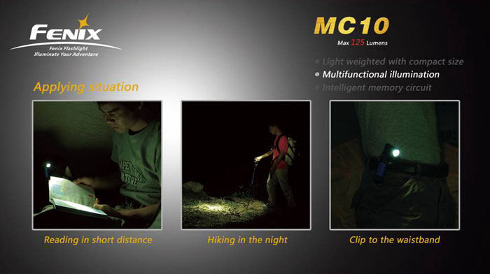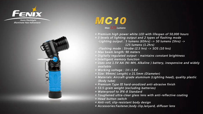 The Fenix Anglelight MC10 is a multifunctional light which combines the features of L-shape flashlight, camping light and headlamp. This light is easy to carry and offers 3 levels of lighting output, 2 flashing modes, and a mas output of 125 lumens with a 90-degree tilting head for omni-directional illumination, meeting your various outdoor lighting demands.