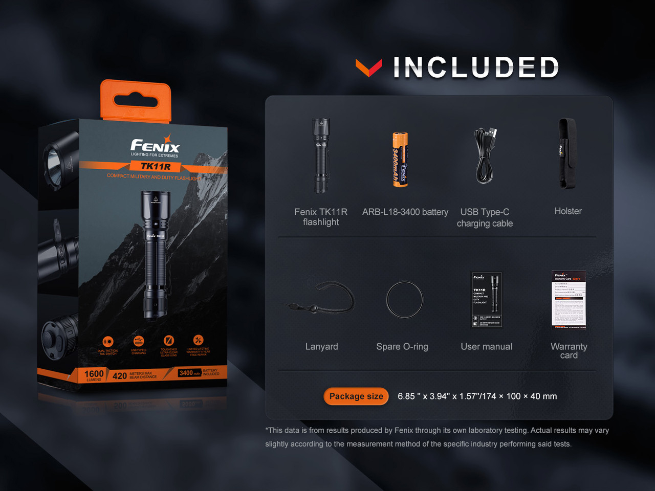 - Included: TK11R Flashlight, ARB-L18-3400 Battery, Holster, Lanyard, Spare O-ring