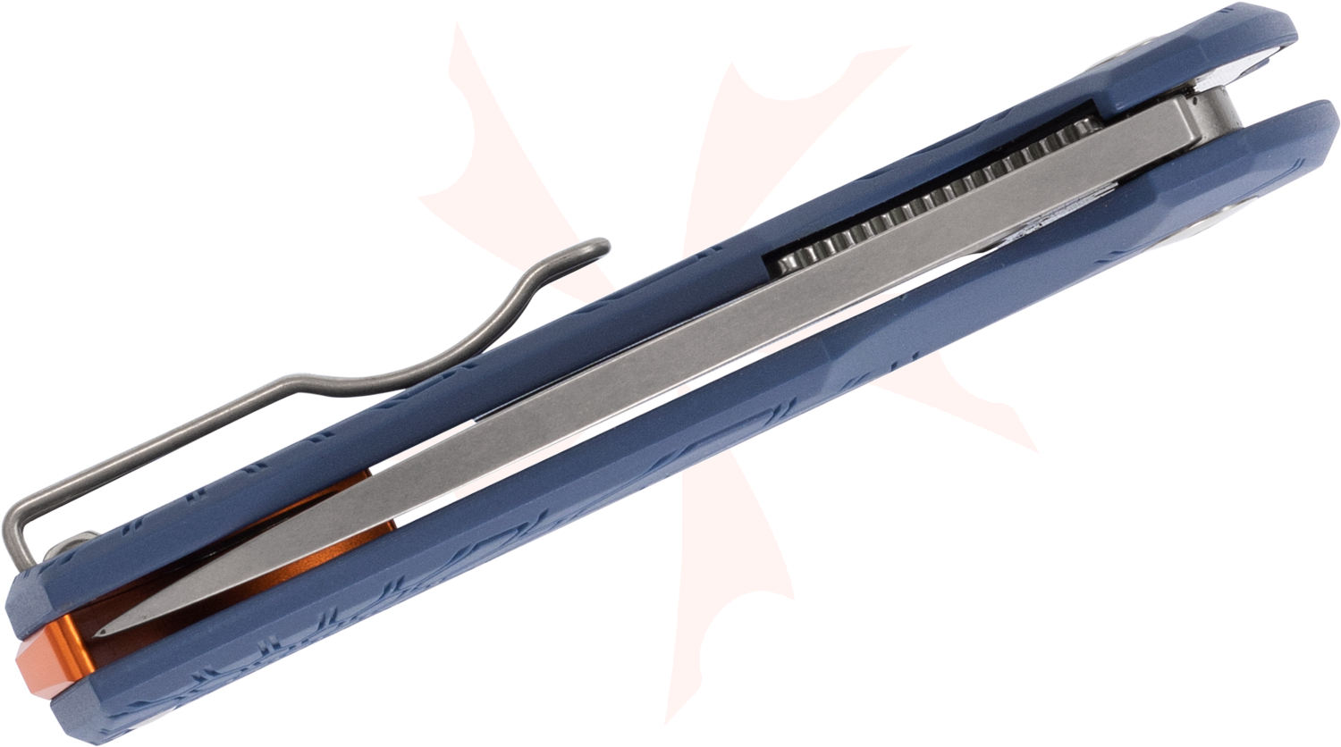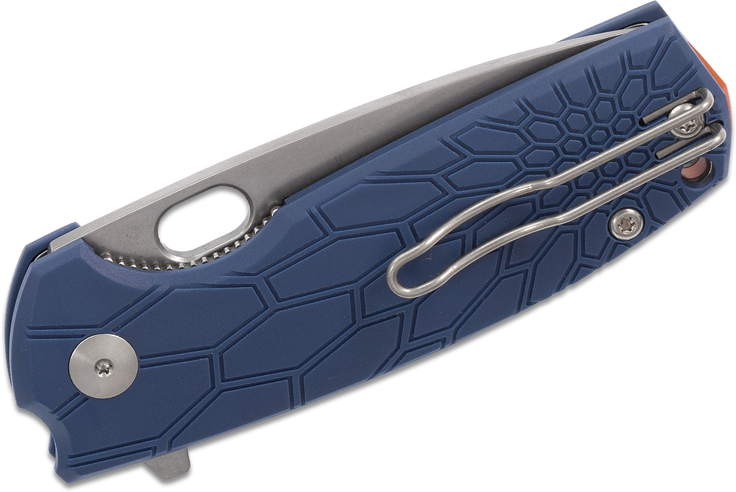 The blue FRN handles sport a geometric pattern and provides traction, while a black backspacer adds contrasting texture. A deep-carry wire clip can be set up for right or left-handed carry and keeps the knife in your pocket in a tip-up configuration for ready deployment.