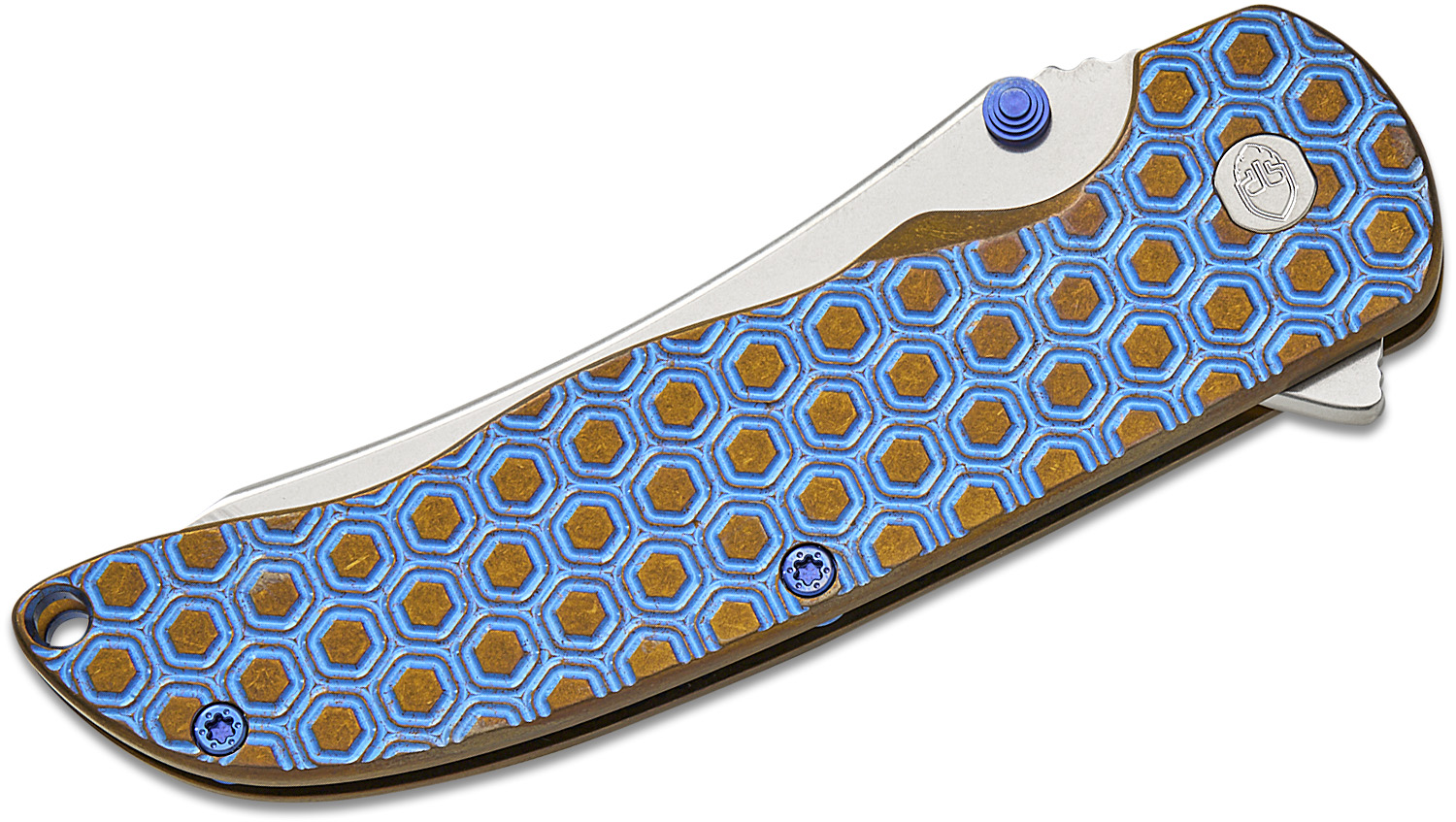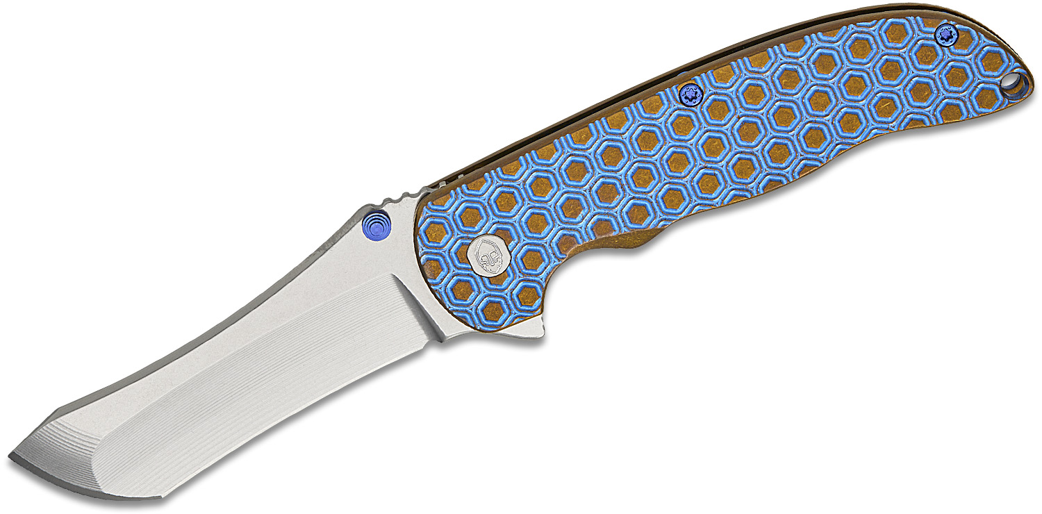 Grimsmo Knives Custom Norseman #8212 Flipper Knife 3.7" RWL-34 Stonewashed Blade, Blue with Bronze Accents Double Honeycomb Pattern Titanium Handles, Frame Lock