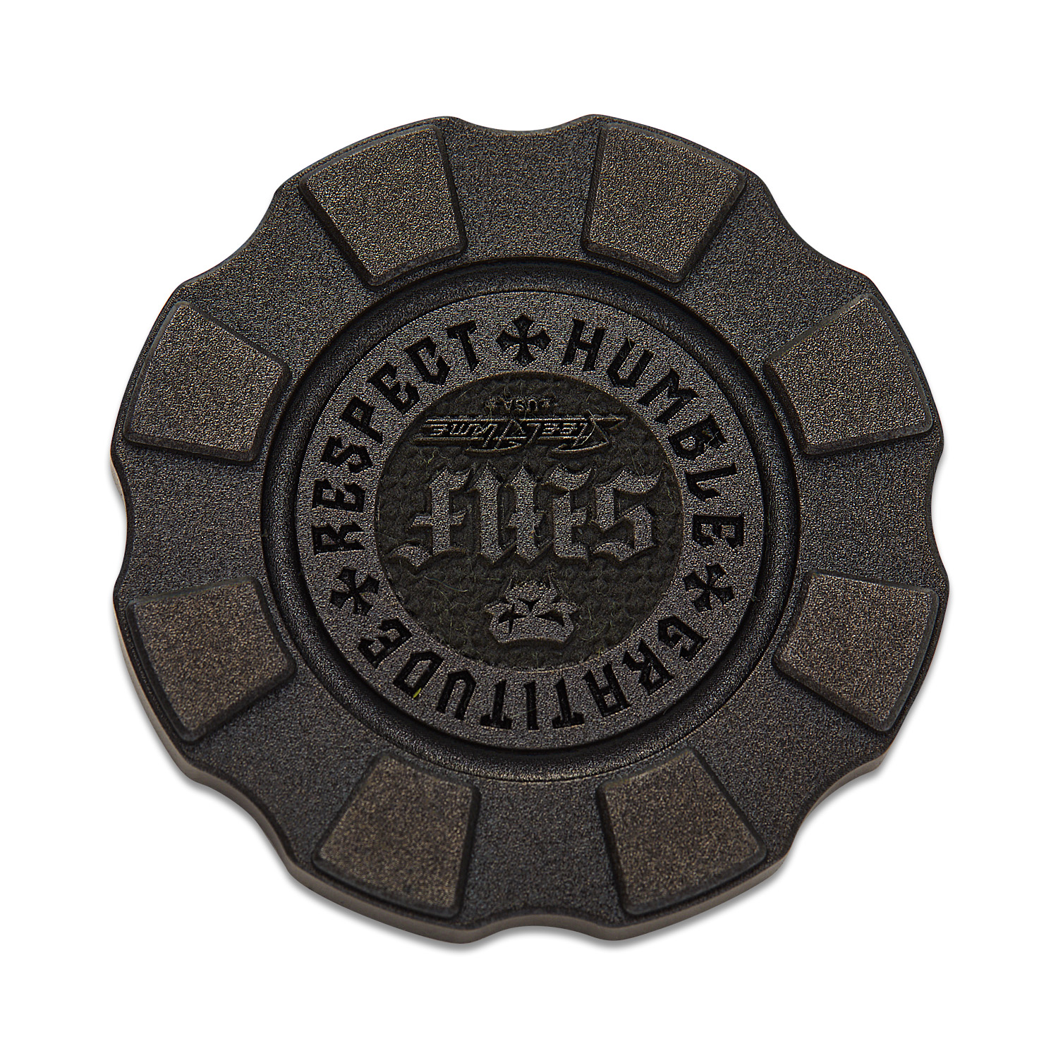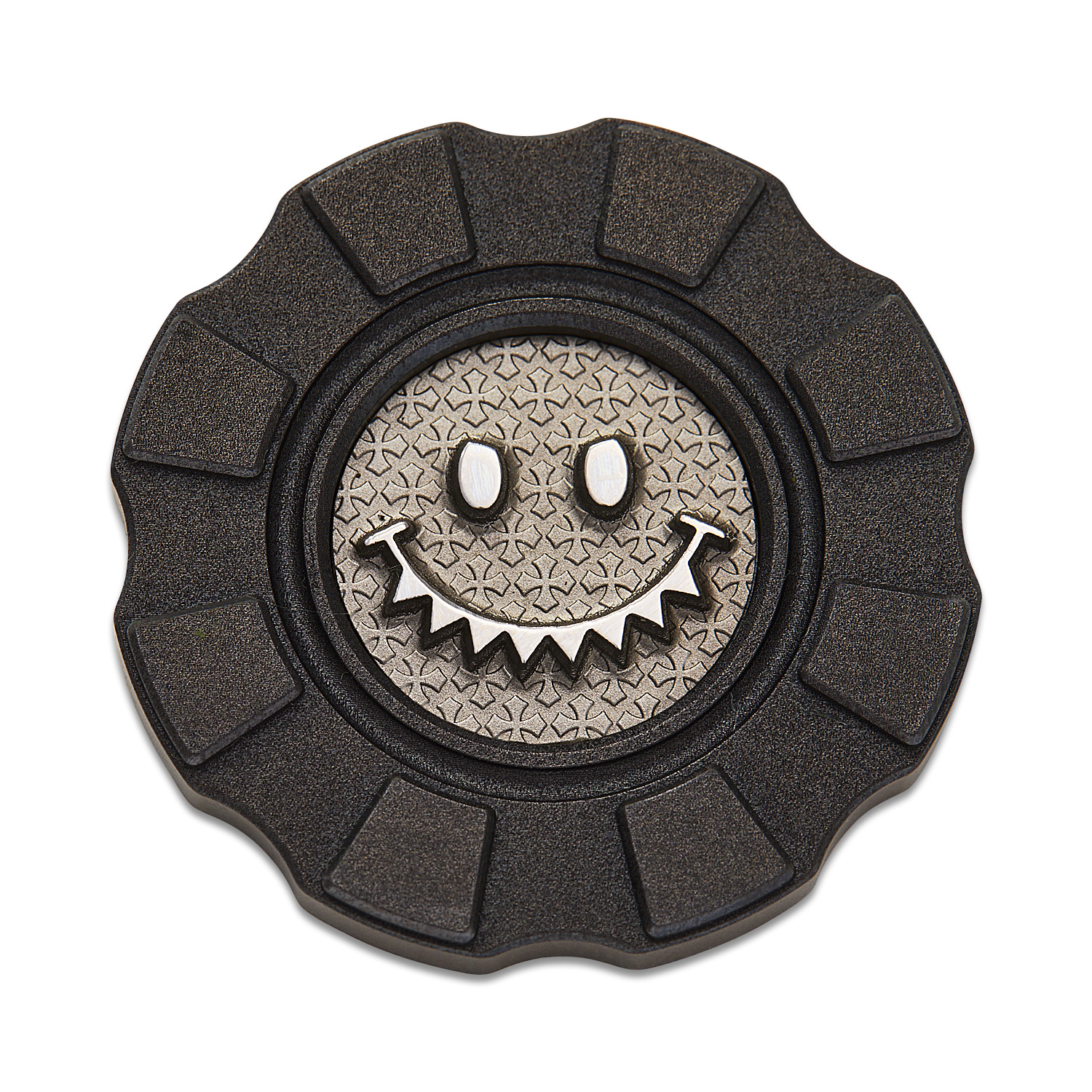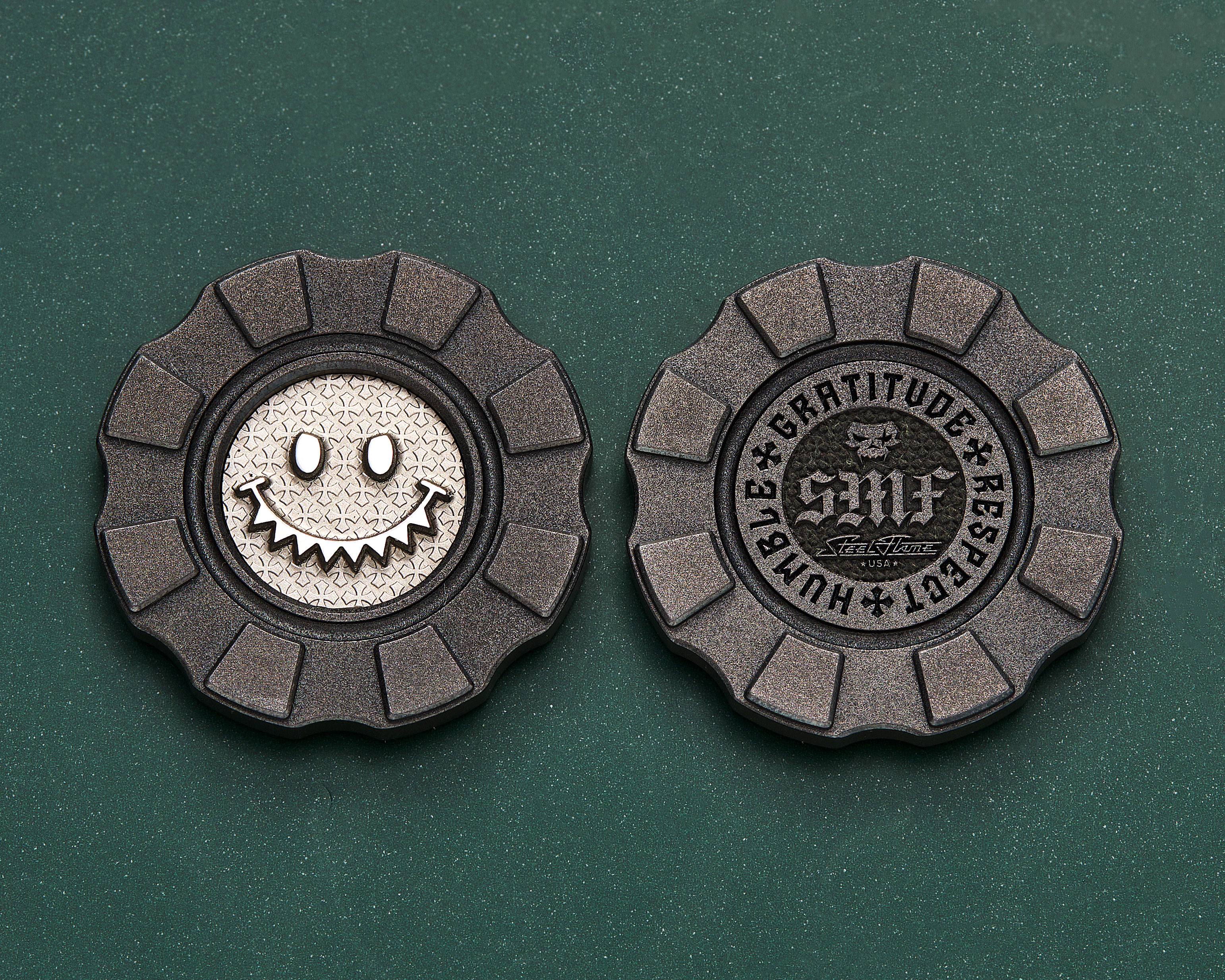 Steel Flame Smiley Face Inlay Titanium Poker Chip. Collaboration with Derrick Obatake of Steel Flame, creator of some of the coolest art and metalwork in the business. Durable Oreo finish for a bit of sparkle and contrasting edges, titanium Smiley Face Inlay, SMF on the reverse. Not eligible for gameplay. Limited production, highly collectible, limited uses, stackable. Made in the USA.