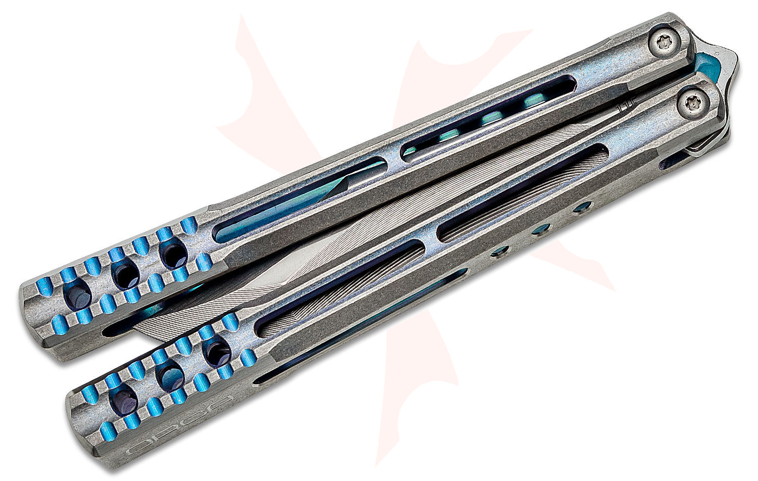 JK Designs Custom Orca #115 Butterfly Knife 4.5" S35VN Low Polished Blade, Integral Stonewashed Teal Anodized Titanium Handles with Milled Accents - Bushing Pivot