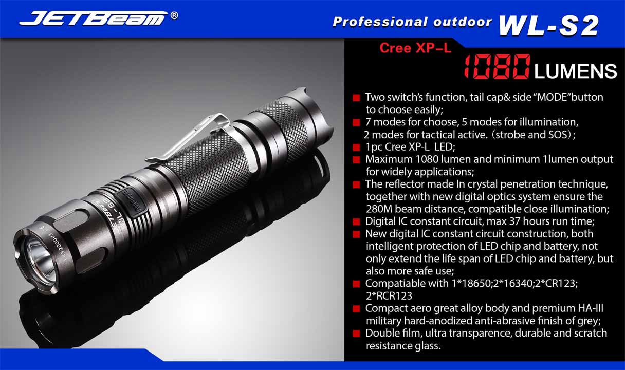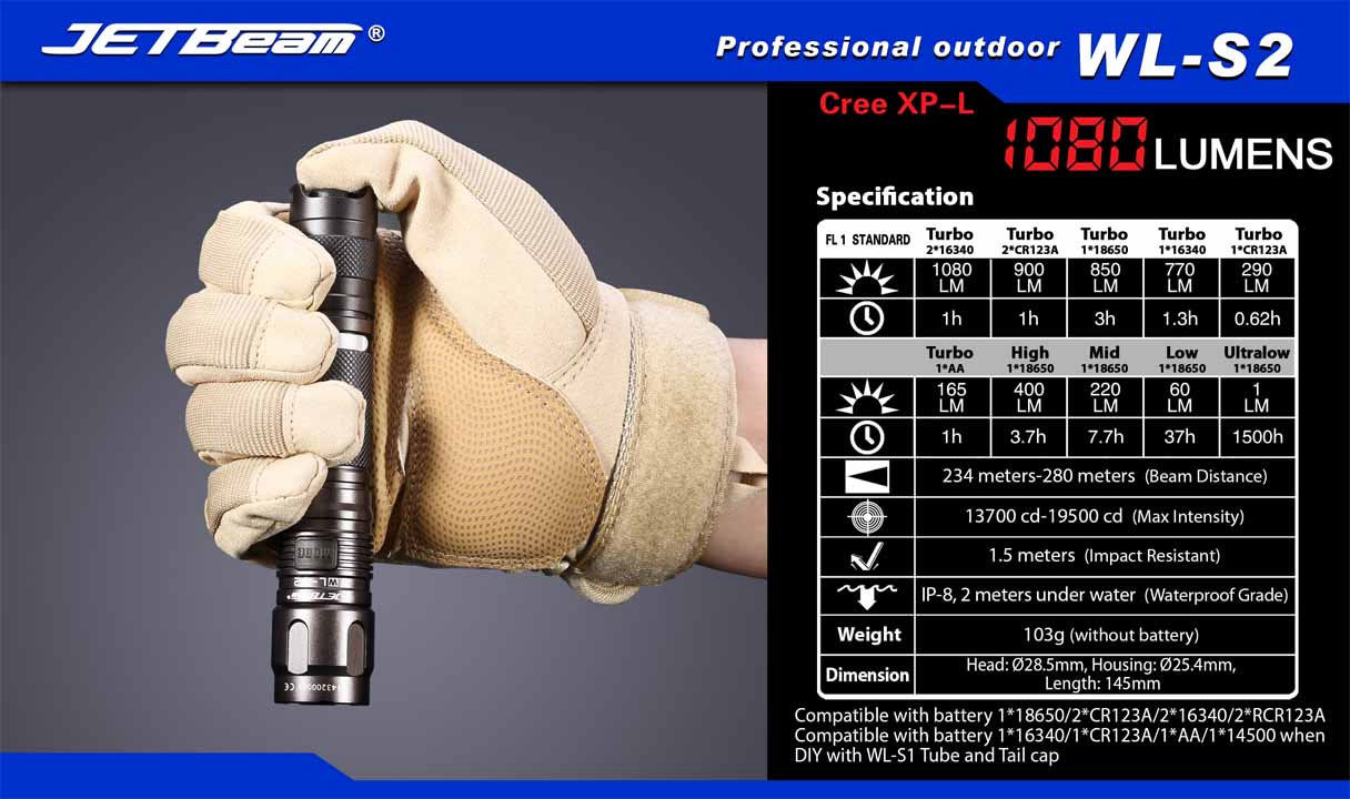 JETBeam WL-S2 Aluminum LED Flashlight 2x16340, 1080 Max Lumens