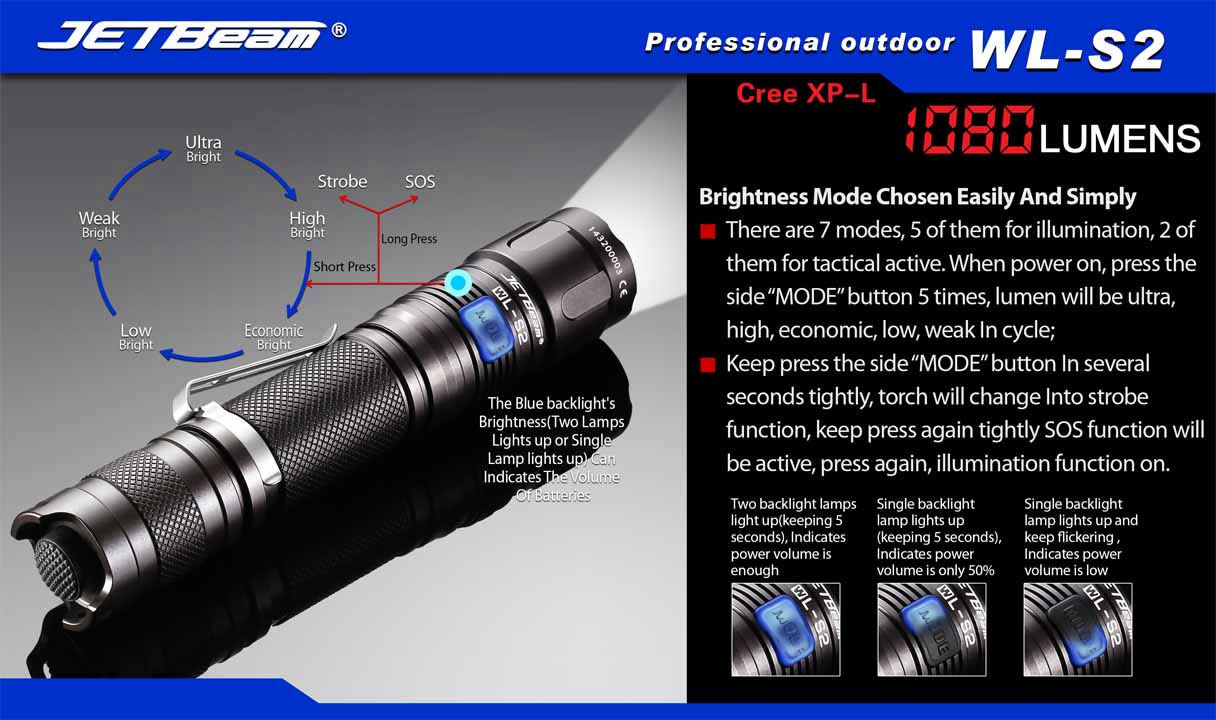 JETBeam has always focused on high-performance LED flashlights. Thanks to its excellent performance and outstanding workmanship, it has a stellar reputation and has been widely used in multiple fields, including outdoor activities, military use, law enforcement, industrial lighting, aviation, marine, etc. In some areas, JETBeam has been regarded as one of the leading mid-to-high end flashlight brands and flashlight technology development explorers. The WL-S2 is a modular flashlight which is compatible with the WL-S1 body and emitter head to give you a variety of battery and brightness options.