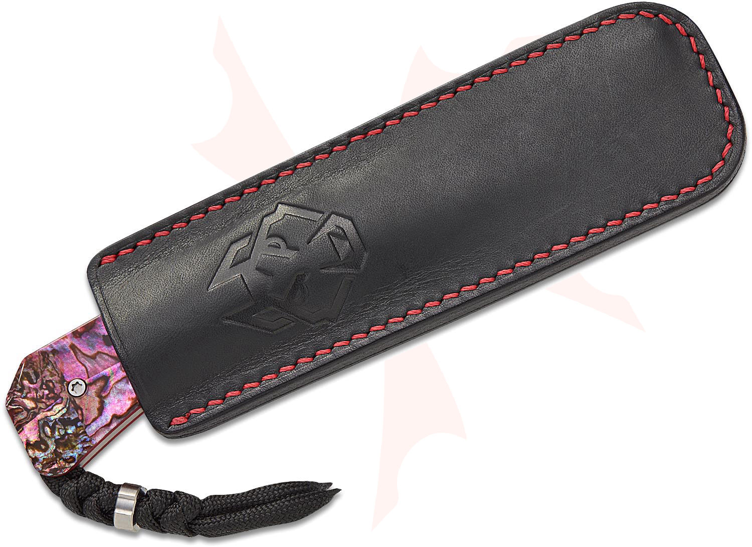 Jack Wolf Knives Pioneer FIXedc Traditional Pocket Fixed Blade Knife 3" CPM-S90V Belt Satin Drop Point Blade, Red Abalone Handles, Leather Sheath - PIONE-FX-01-RED-ABALONE