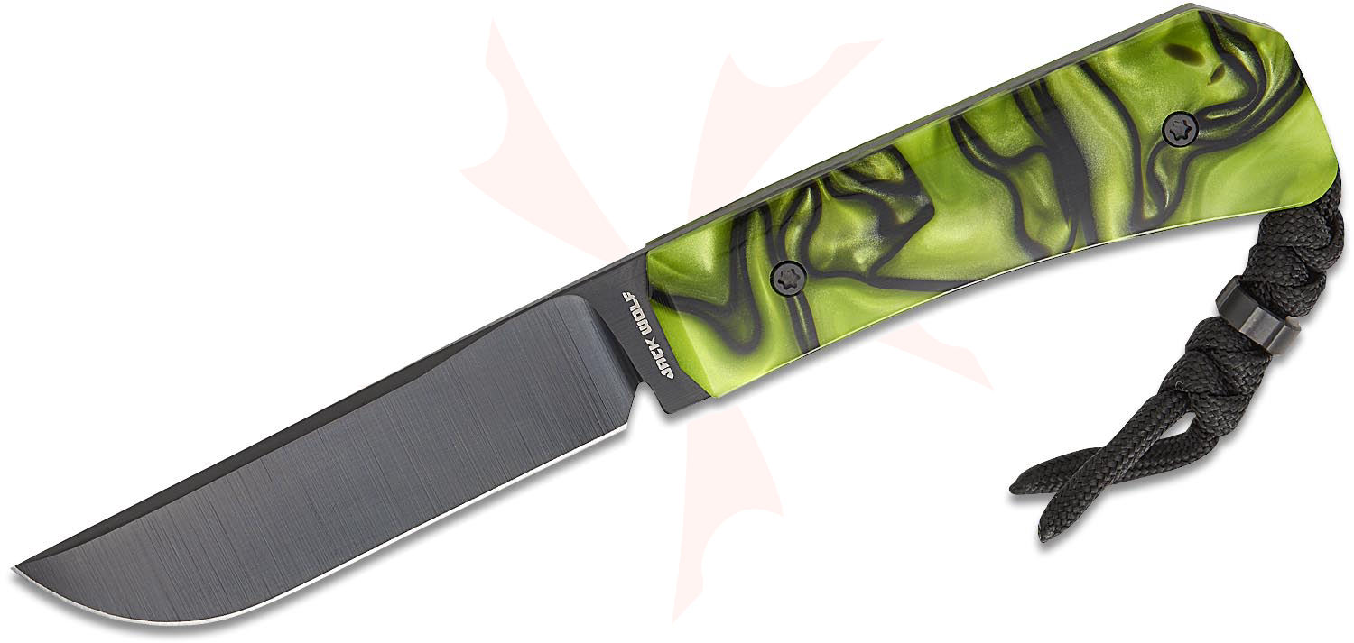 Jack Wolf Knives Pioneer FIXedc Traditional Pocket Fixed Blade Knife 3" CPM-S90V Black DLC Drop Point Blade, Toxic Green Kirinite Handles, Leather Sheath - PIONE-FX-01-KIR-TOX-GRN