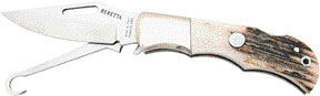 Beretta Stag Bird Knife. 4" closed lockback. 440C stainless clip blade and bird hook. Genuine stag handles with nickel silver bolster and inlay shield. Lanyard hole. Nylon belt pouch. Made in Italy.