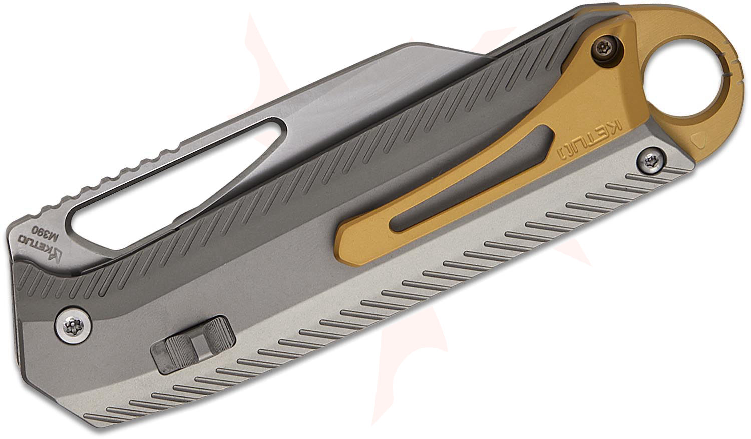 Ketuo Knife Ventr V4 Button Liner Lock Folding Knife 2.8" M390 Hand-Rubbed Satin Clip Point Blade, Bead Blasted Titanium Handles, Gold Accents, Safety Lock - KT-VENTR V4 G/P