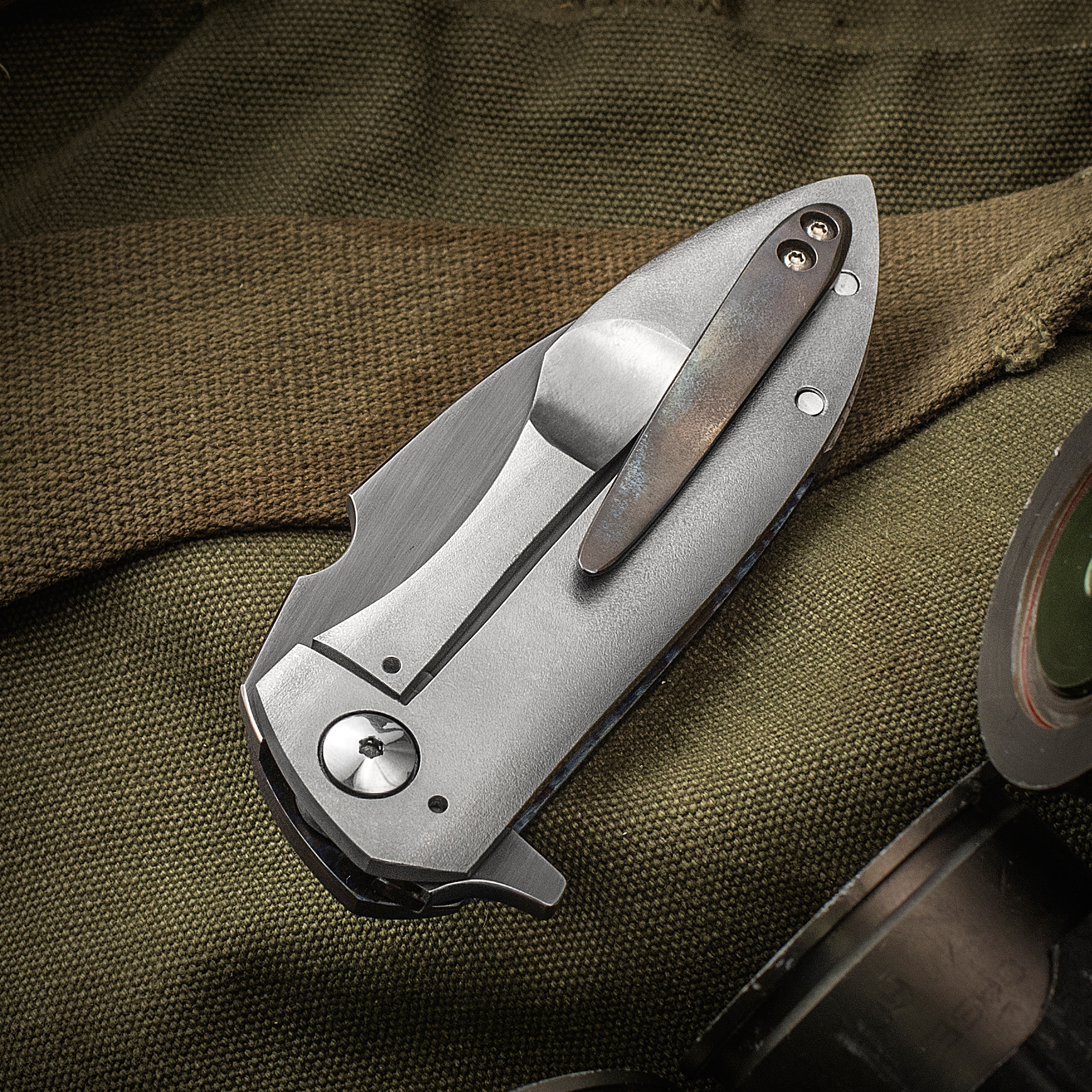 Kendall Hughes Custom Oath Flipper 2.75" CPM-S110V Acid Etched Blade, Timascus and Orange Peel Titanium Handles, Zirconium Clip, Frame Lock