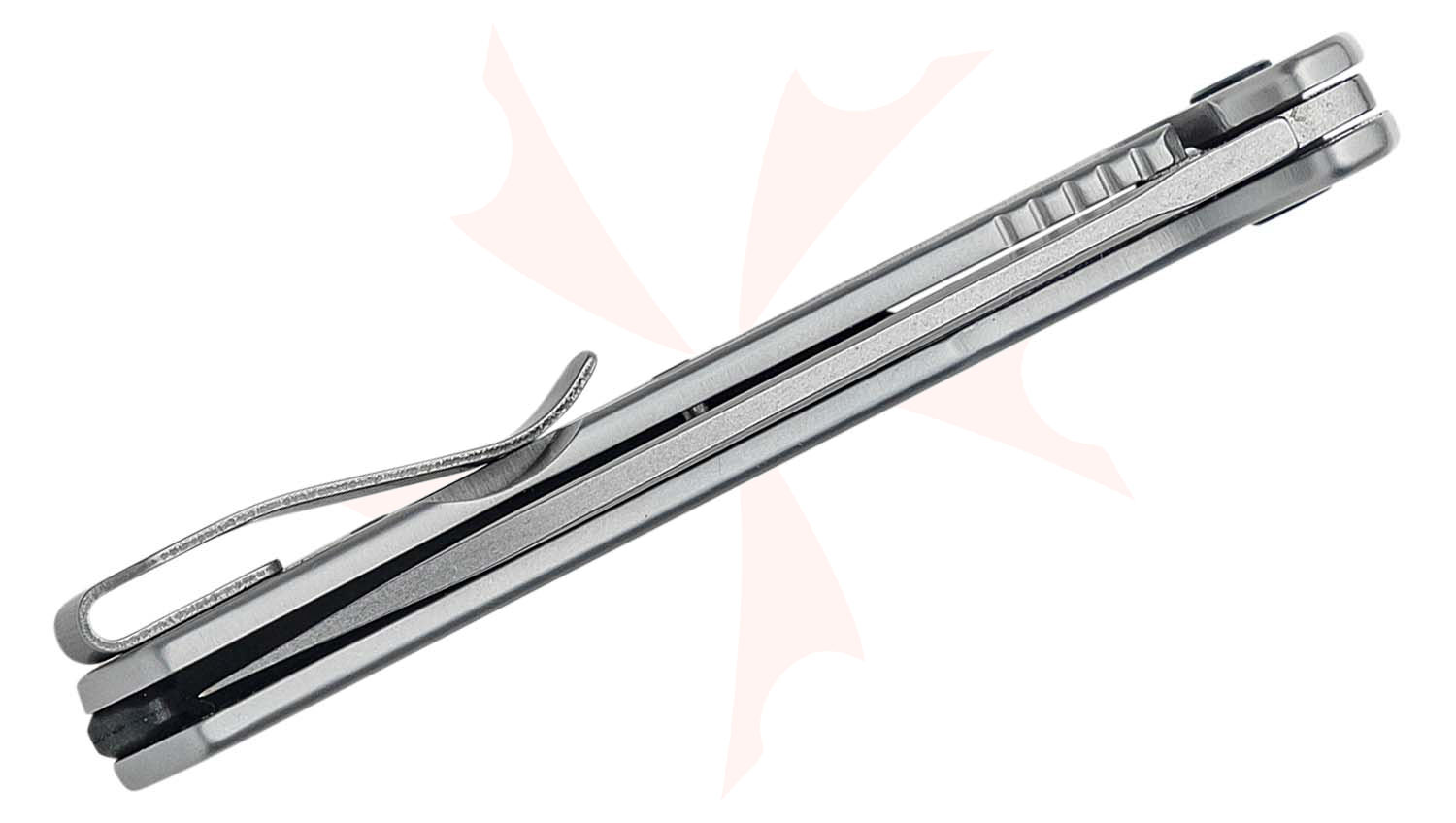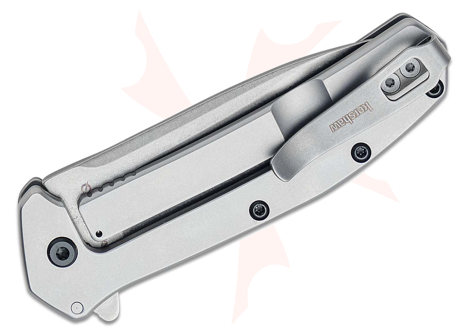 KnifeCenter QuickFlick: Kershaw 2044 Outcome Assisted Flipper Knife 2.8" Stonewashed Drop Point Blade, Stainless Steel Handles, Reversible Clip - KnifeCenter