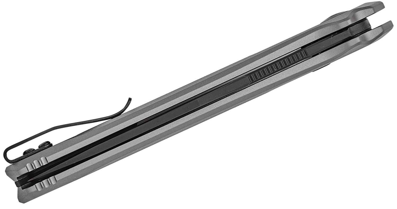 - Gray anodized aluminum handle is comfortably textured with G10 inlays
