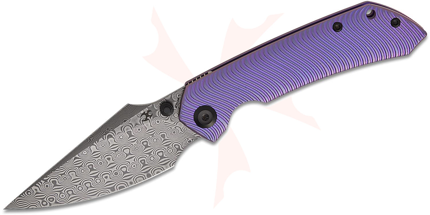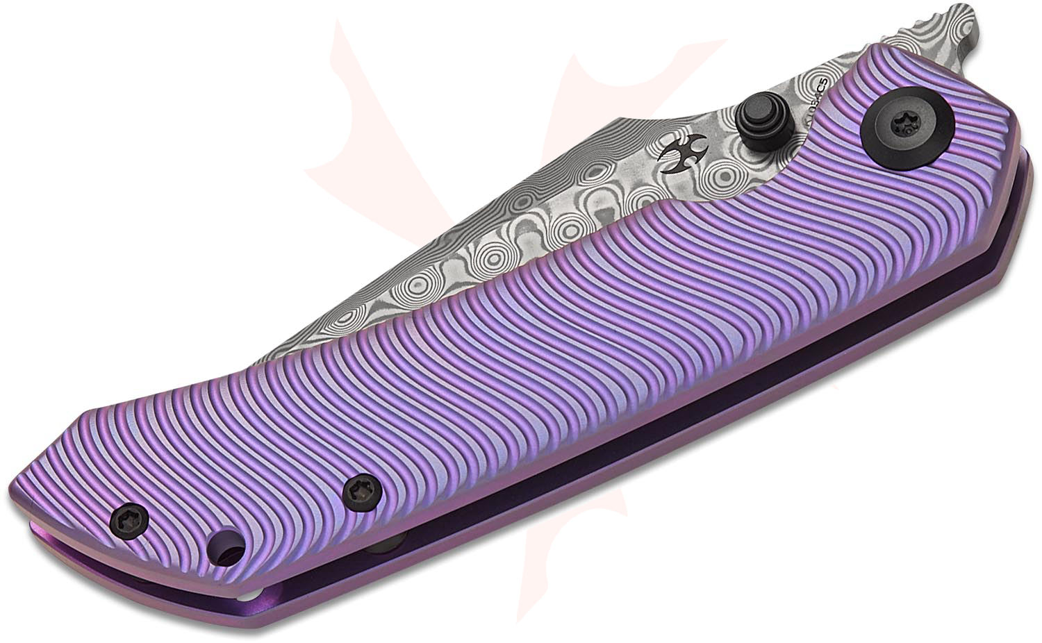 Kansept Knives Fenrir Frame Lock Front Flipper Knife 3.48" Damascus Harpoon Blade, Purple Micro Milled "Water Ripple" Titanium Handles - K1034C5