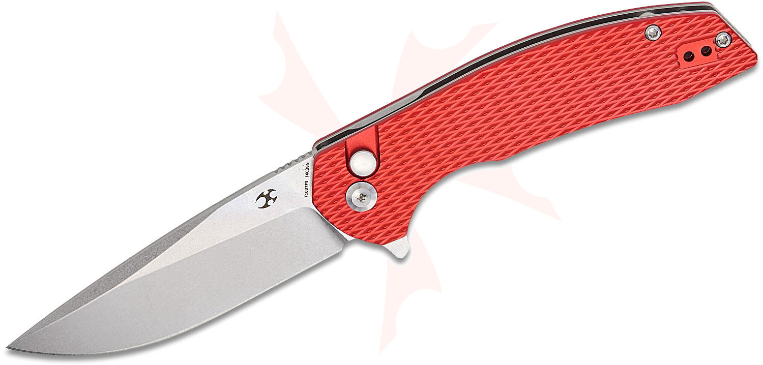Kansept Knives Accipiter Button Lock Flipper Knife 3.53" 14C28N Stonewashed Drop Point Blade, Red Diamond Texture Aluminum Handles - T1007F3