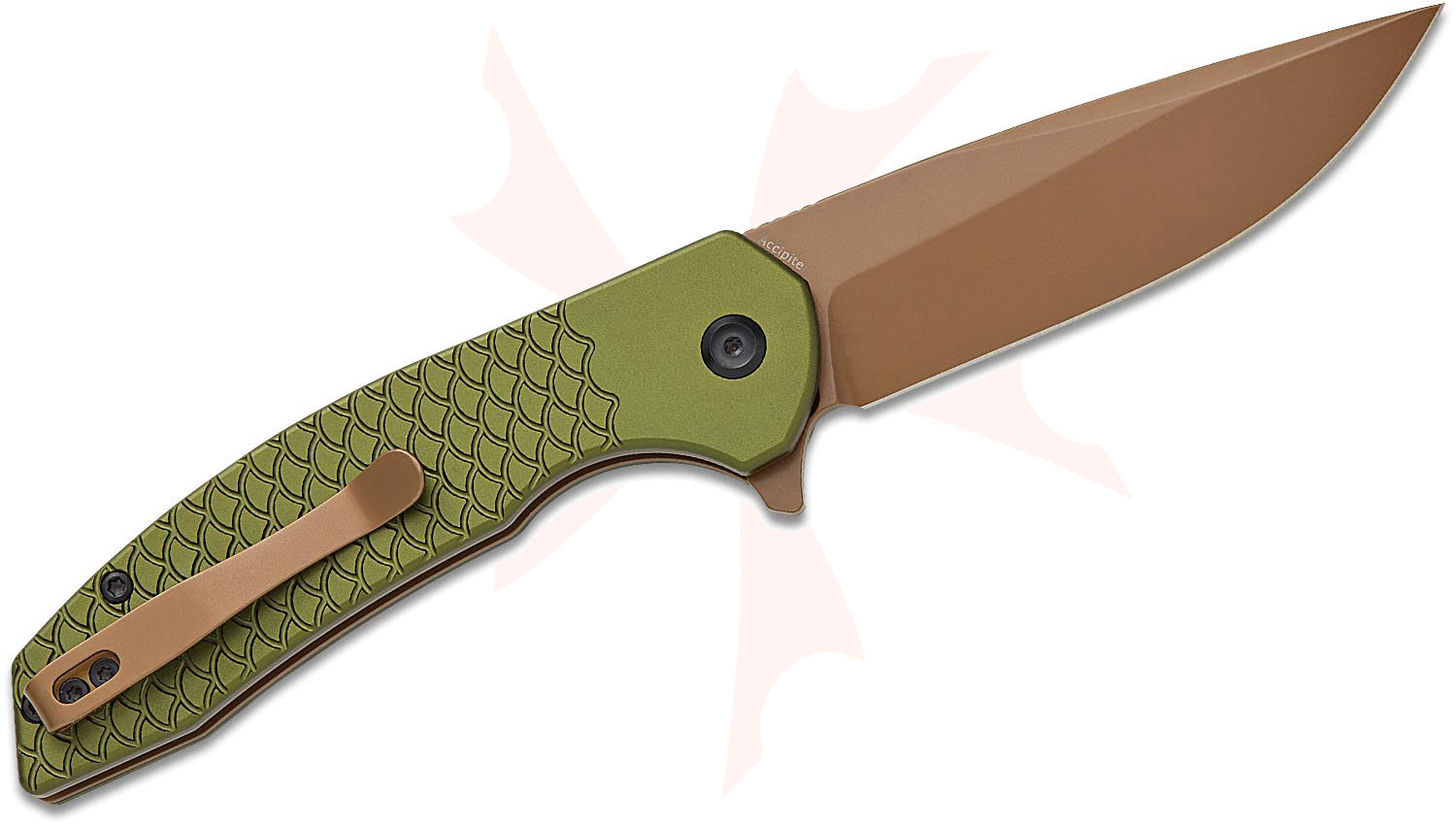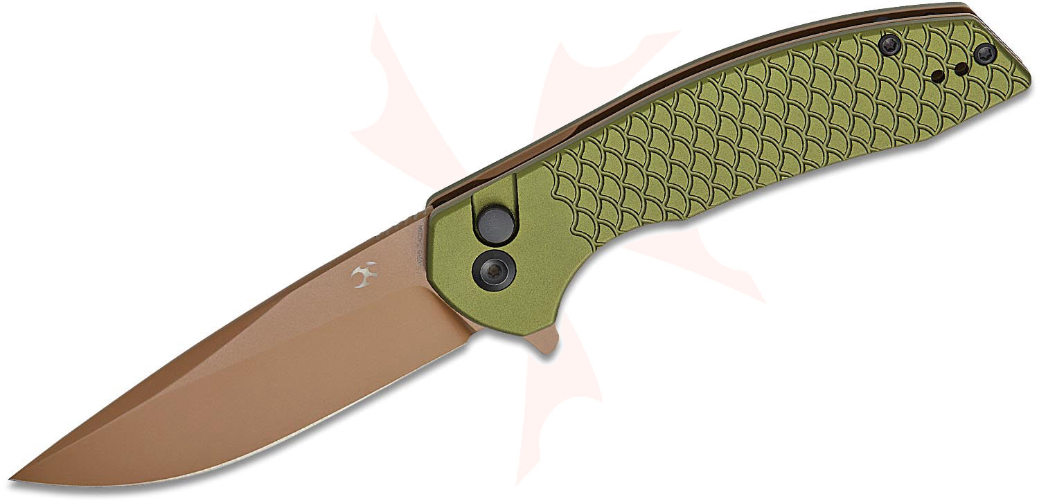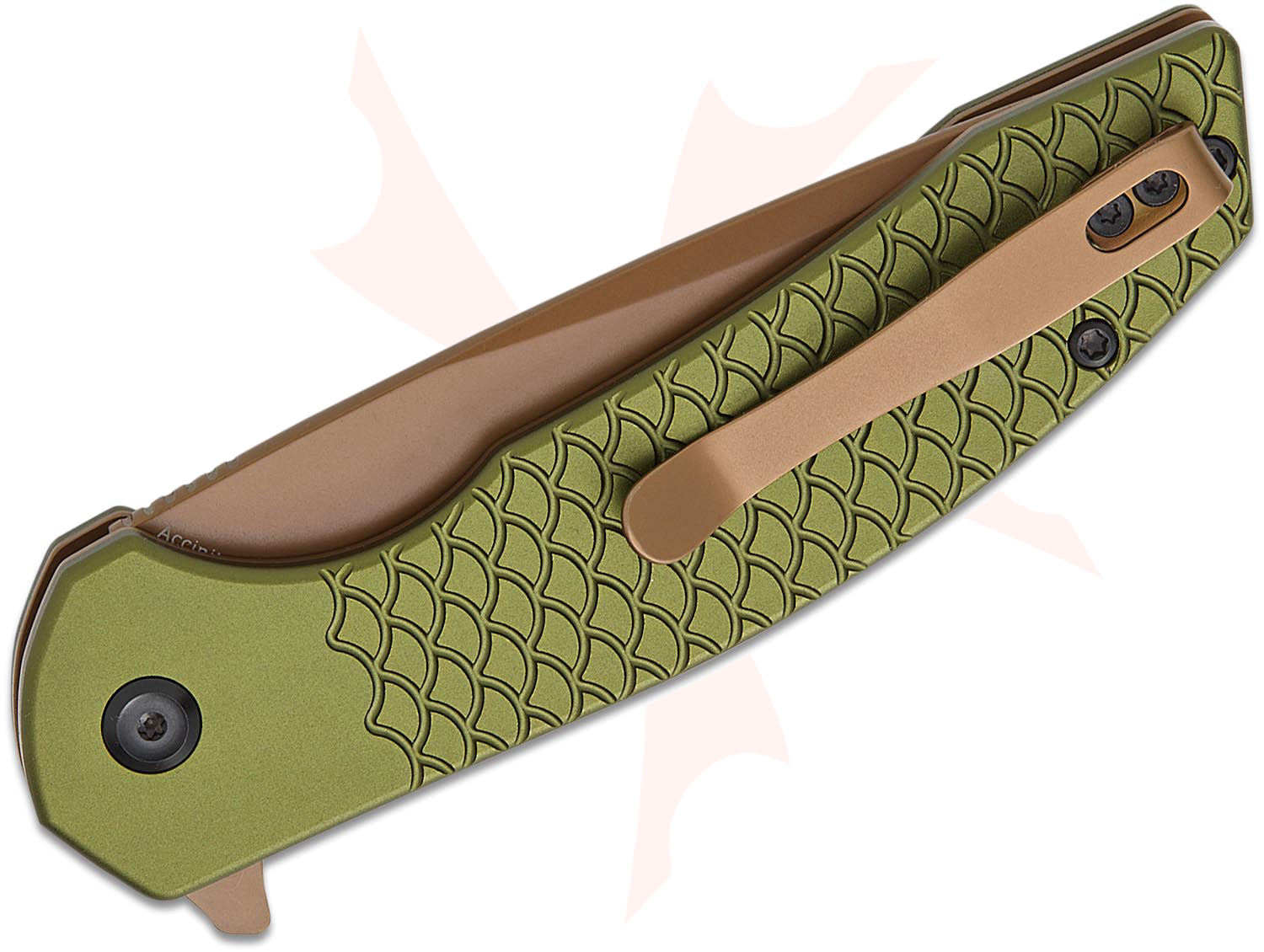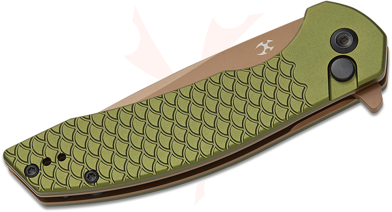 Kansept Knives Accipiter Button Lock Flipper Knife 3.53" 14C28N Rose Gold Drop Point Blade, Green Fish Scale Aluminum Handles - T1007F5