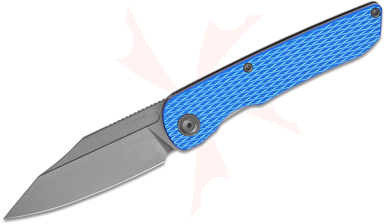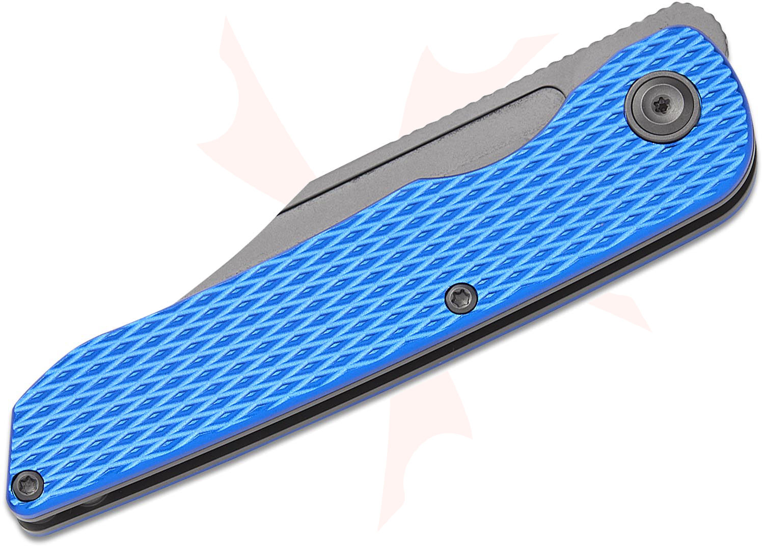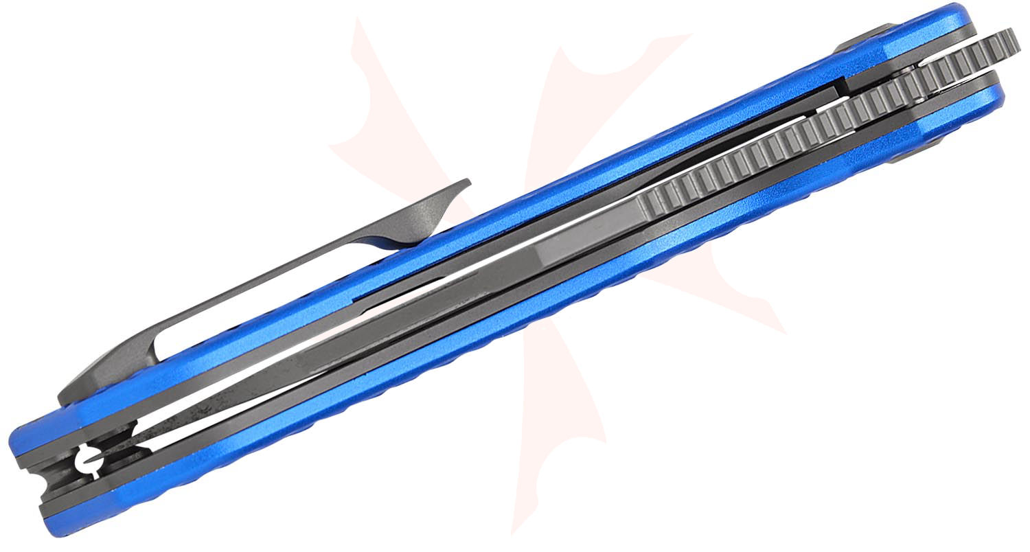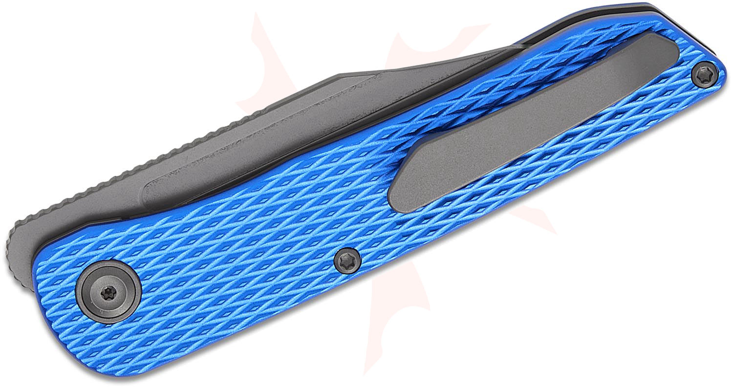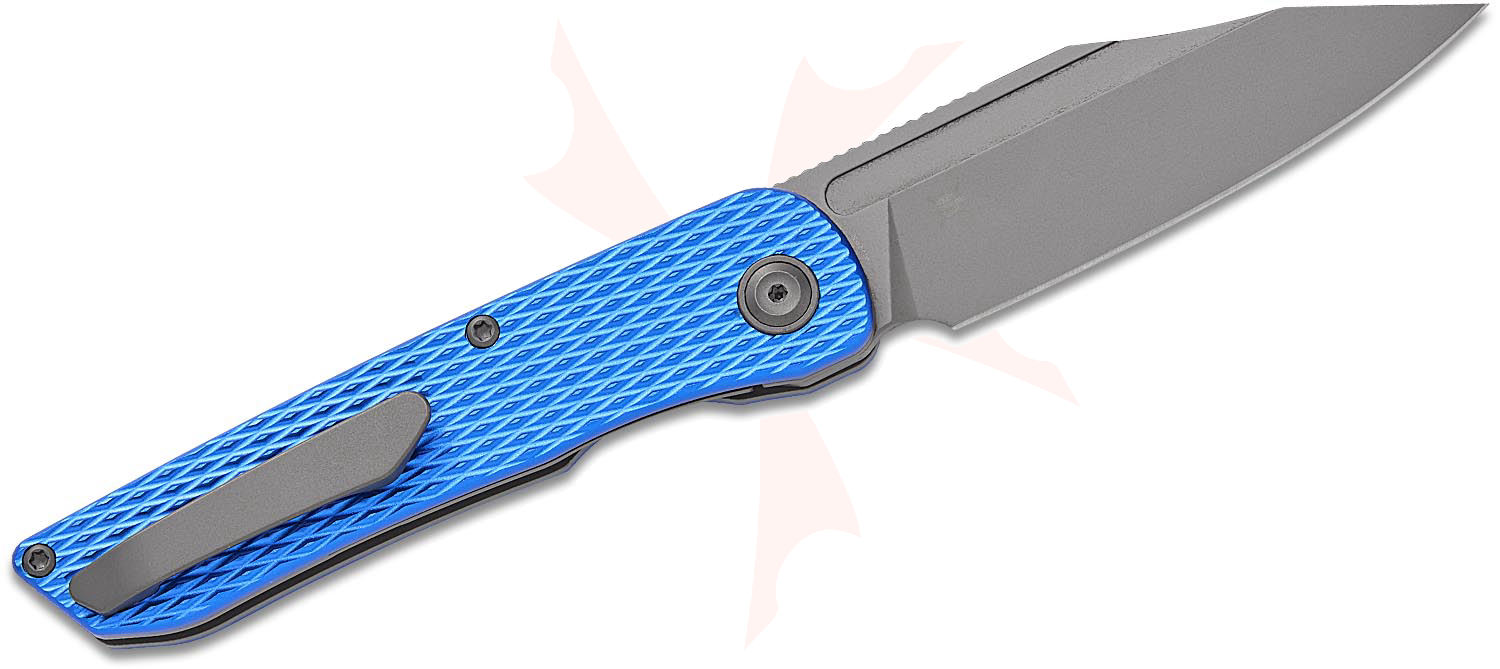 Kansept Knives Nettle Front Flipper Knife 3.28" 154CM Gray TiNi Coated Reverse Tanto Blade, Diamond Texture Blue Aluminum Handles, Liner Lock - T1103A2