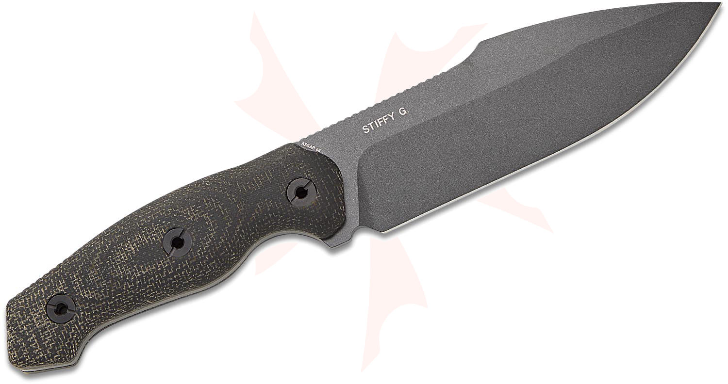 The Kunwu Knives Stiffy G is a large, high-performance fixed blade that embodies incredible strength and resilience. Designed as a rugged everyday carry, this knife is built from an exceptional piece of ASSAB 88 tool steel, known for its outstanding wear and chipping resistance. This tool steel allows for a high hardness rating of 62-64 HRC, ensuring the blade holds a razor-sharp edge through demanding tasks. Its full-tang construction and durable Micarta handle provide a solid, no-nonsense feel that inspires confidence in hand. With its robust 6.1" harpoon blade and flat grind, the Stiffy G is perfectly suited for a wide range of everyday and outdoor cutting chores. Weighing in at 12.56 ounces (without the sheath), this camp companion is the perfect addition to any survivalist's pack, ensuring that when you need to chop, slice, or dice, you have a knife that's ready to tackle it all.