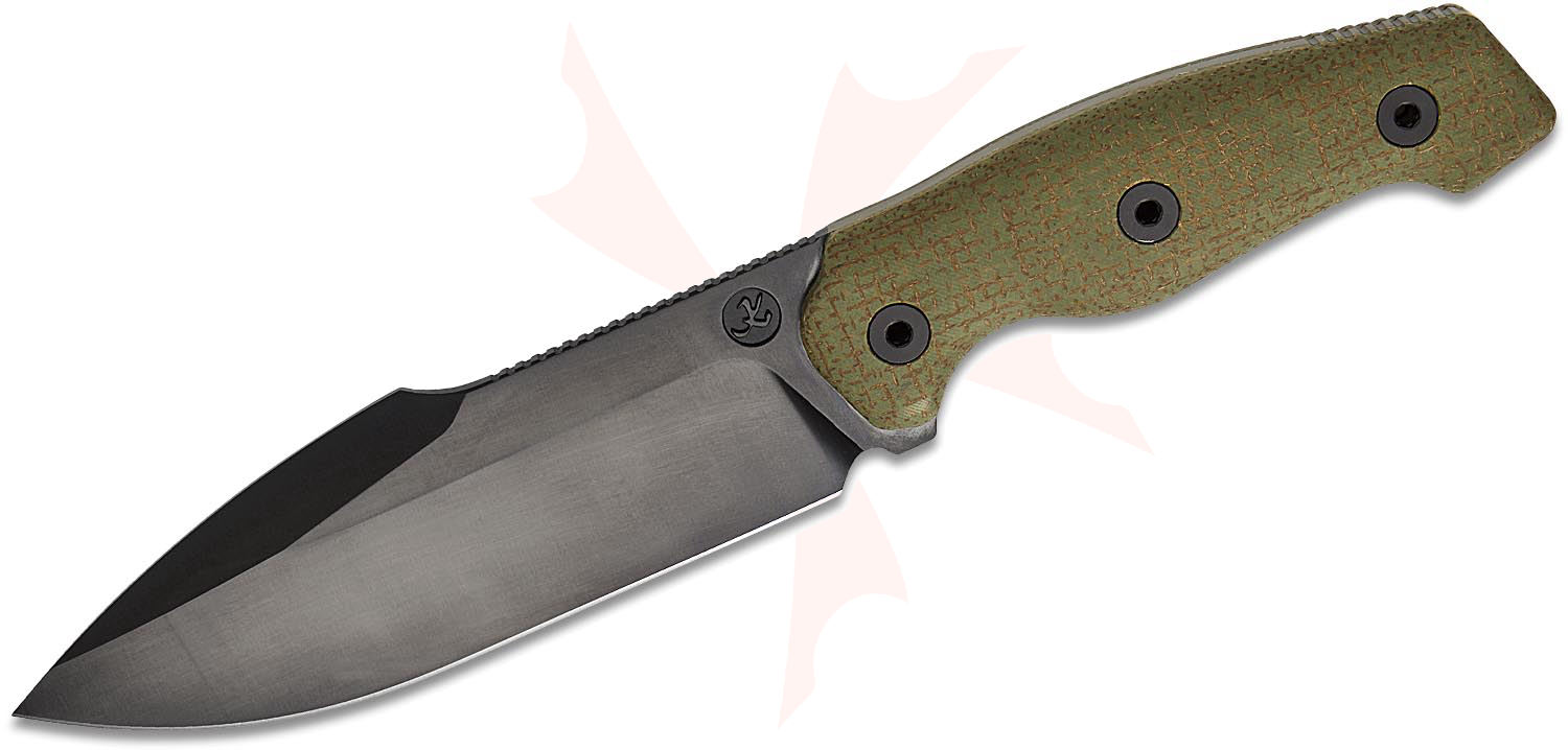 Kunwu Knives Stiffy G Fixed Blade Knife 6.1" ASSAB 88 Black DLC Harpoon Blade, Olive Green Micarta Handles, Kydex Sheath - F712-GN-4