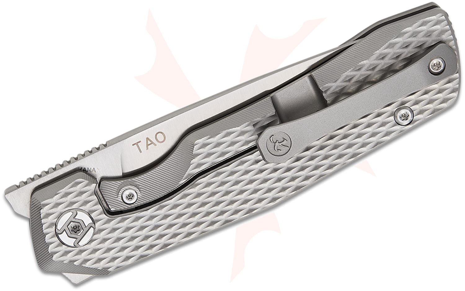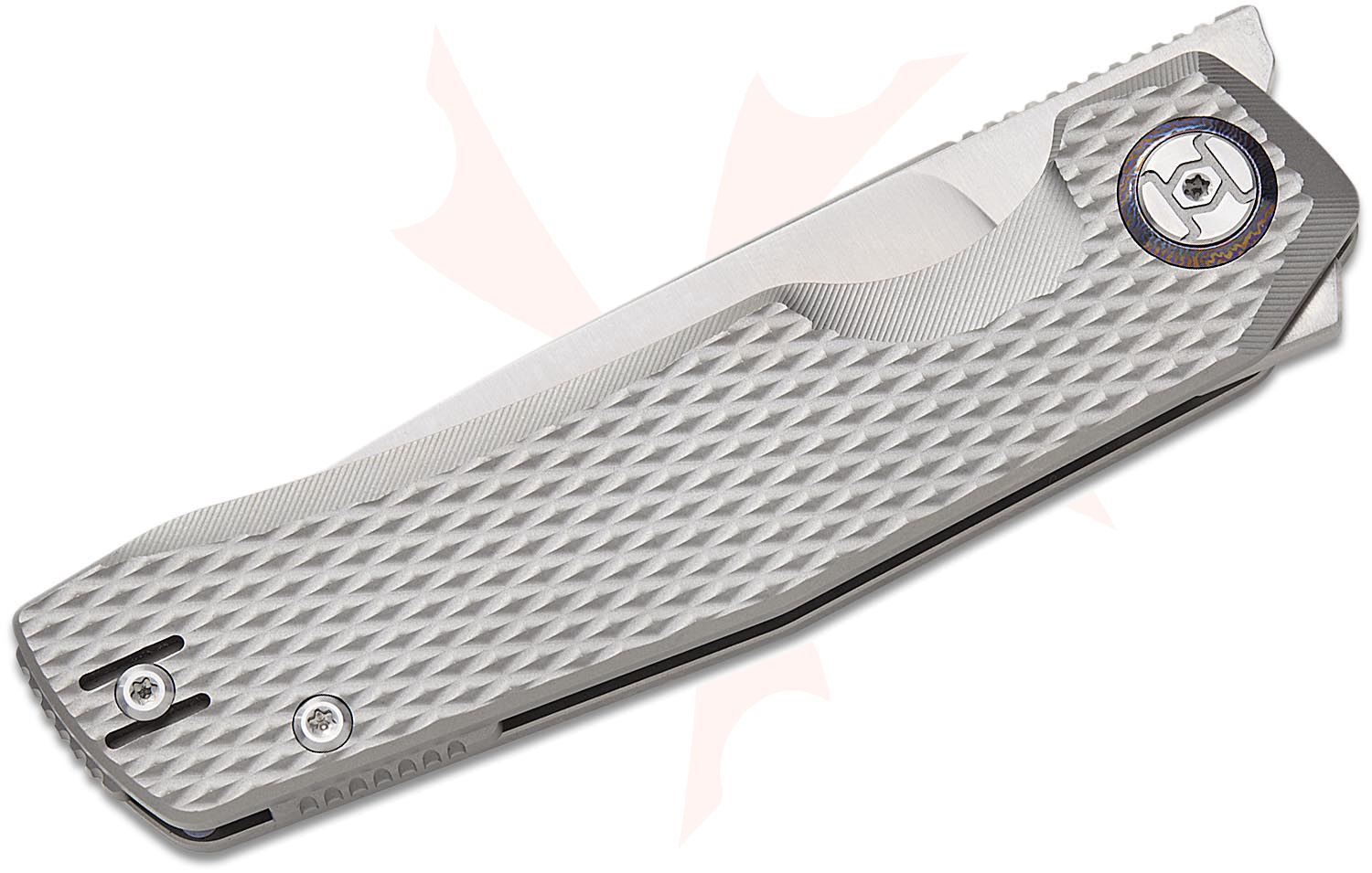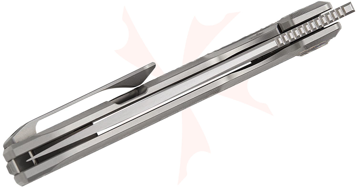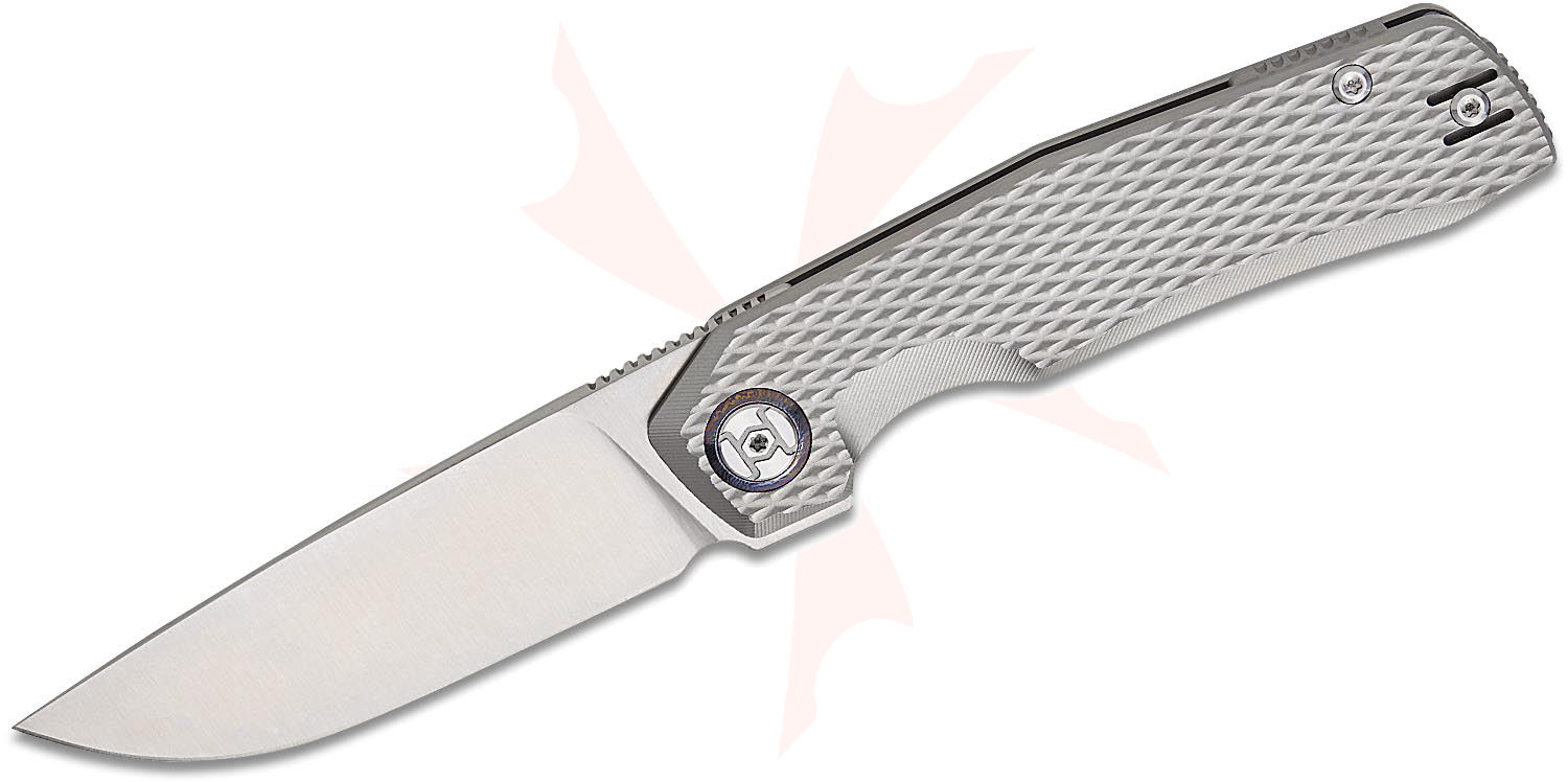 Kunwu Knives TAO II Frame Lock Flipper Knife 3.5" Vanax Satin Drop Point Blade, Gray Diamond Textured Titanium Handles, Timascus Pivot Collar - K703T-1