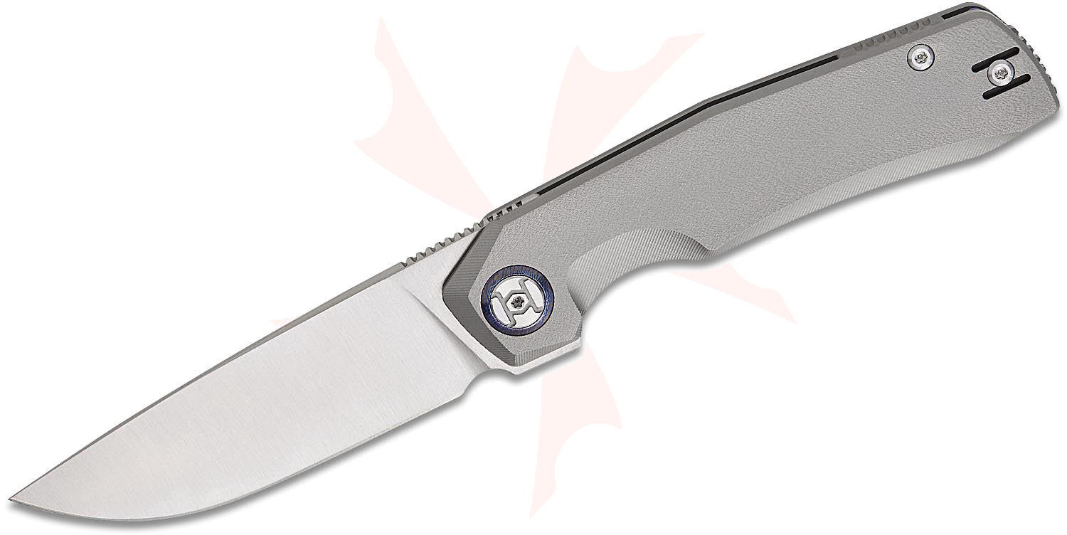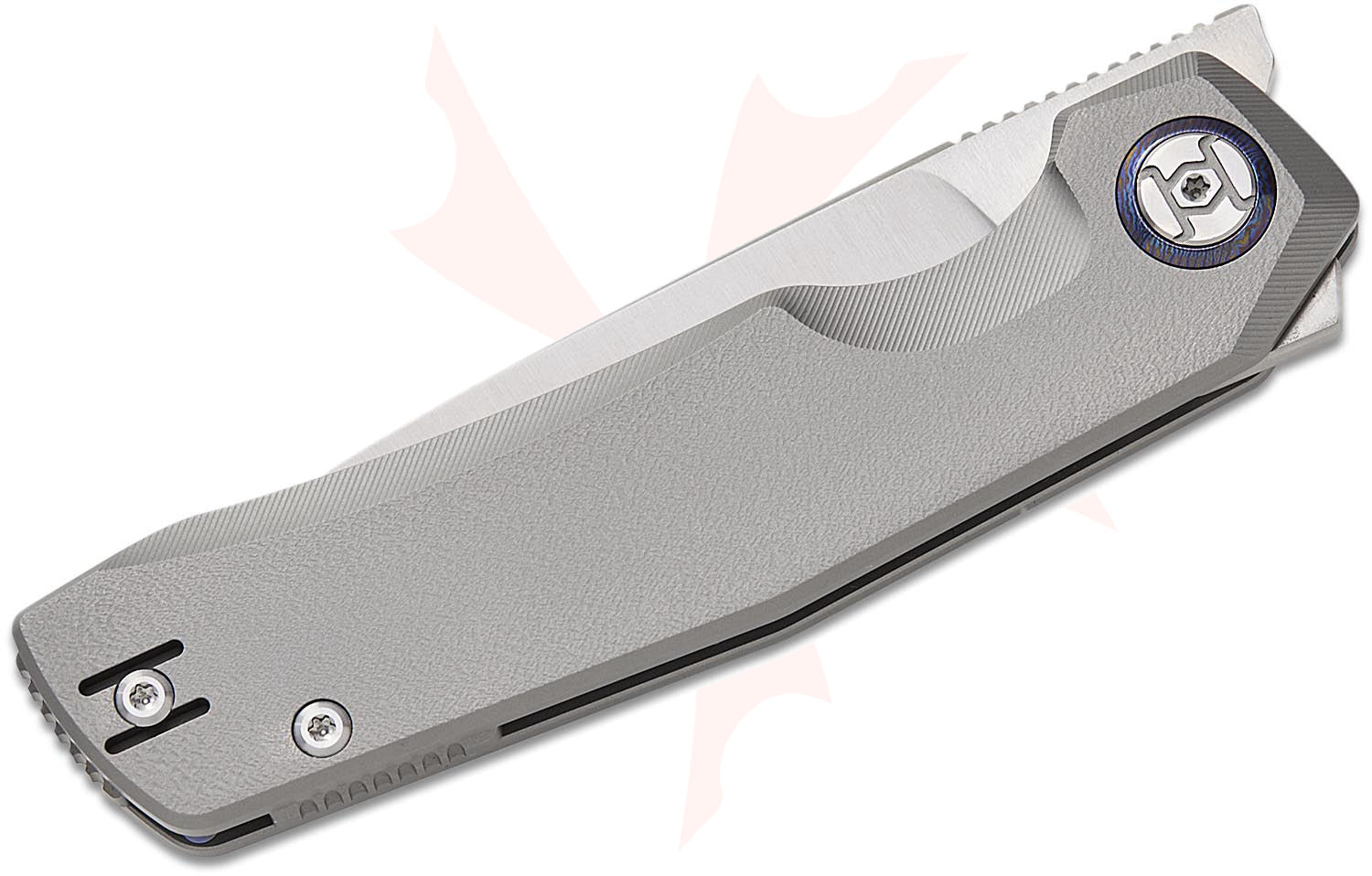 Kunwu Knives TAO II Frame Lock Flipper Knife 3.5" Vanax Satin Drop Point Blade, Gray Orange-Peel Textured Titanium Handles, Timascus Pivot Collar - K703T-2