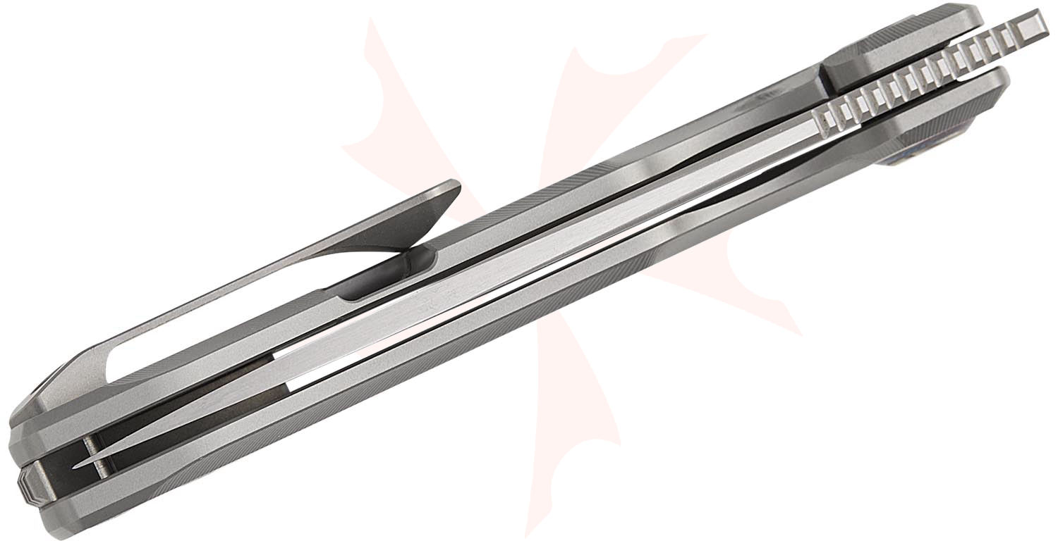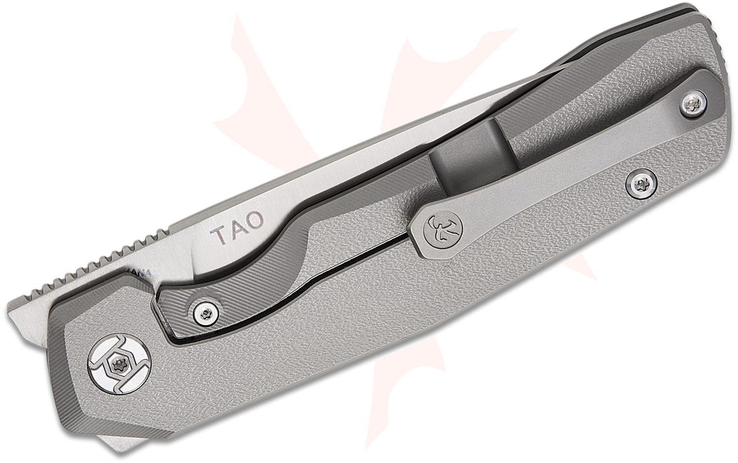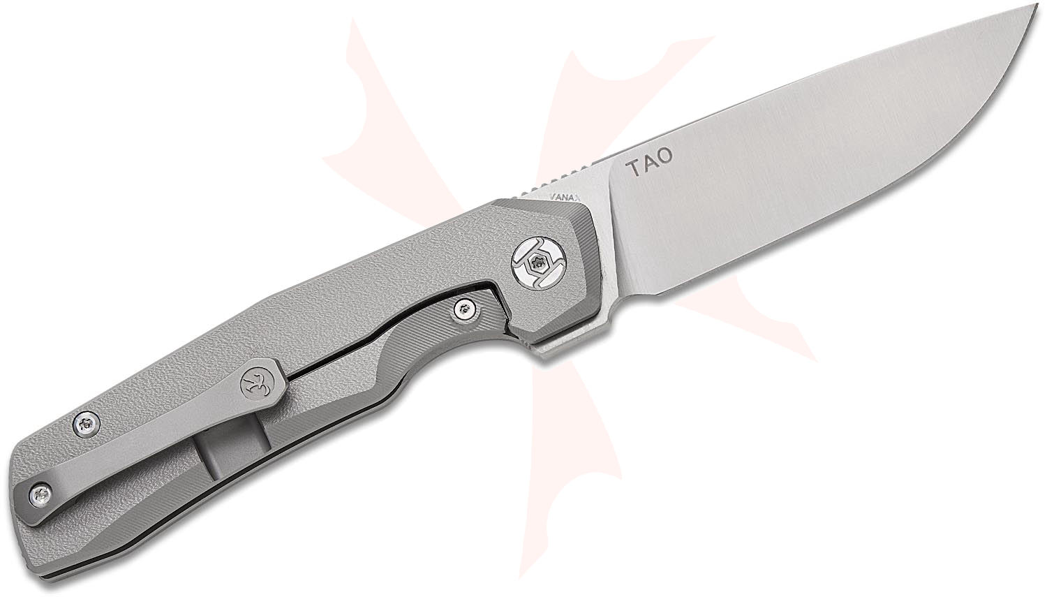 The Kunwu TAO II is a precision-built flipper knife that blends modern materials with a rugged, functional design. Its drop point blade, crafted from Vanax stainless steel, delivers exceptional edge retention and cutting performance. A smooth frame lock ensures secure operation, while the orange-peel textured titanium handle provides a firm, comfortable grip. Ball bearings in the pivot allow for exceptionally smooth action with both the traditional and front-flipper tab-opening methods. With a milled titanium pocket clip for versatile pocket placement, the TAO II is a robust yet refined everyday carry knife built to perform.