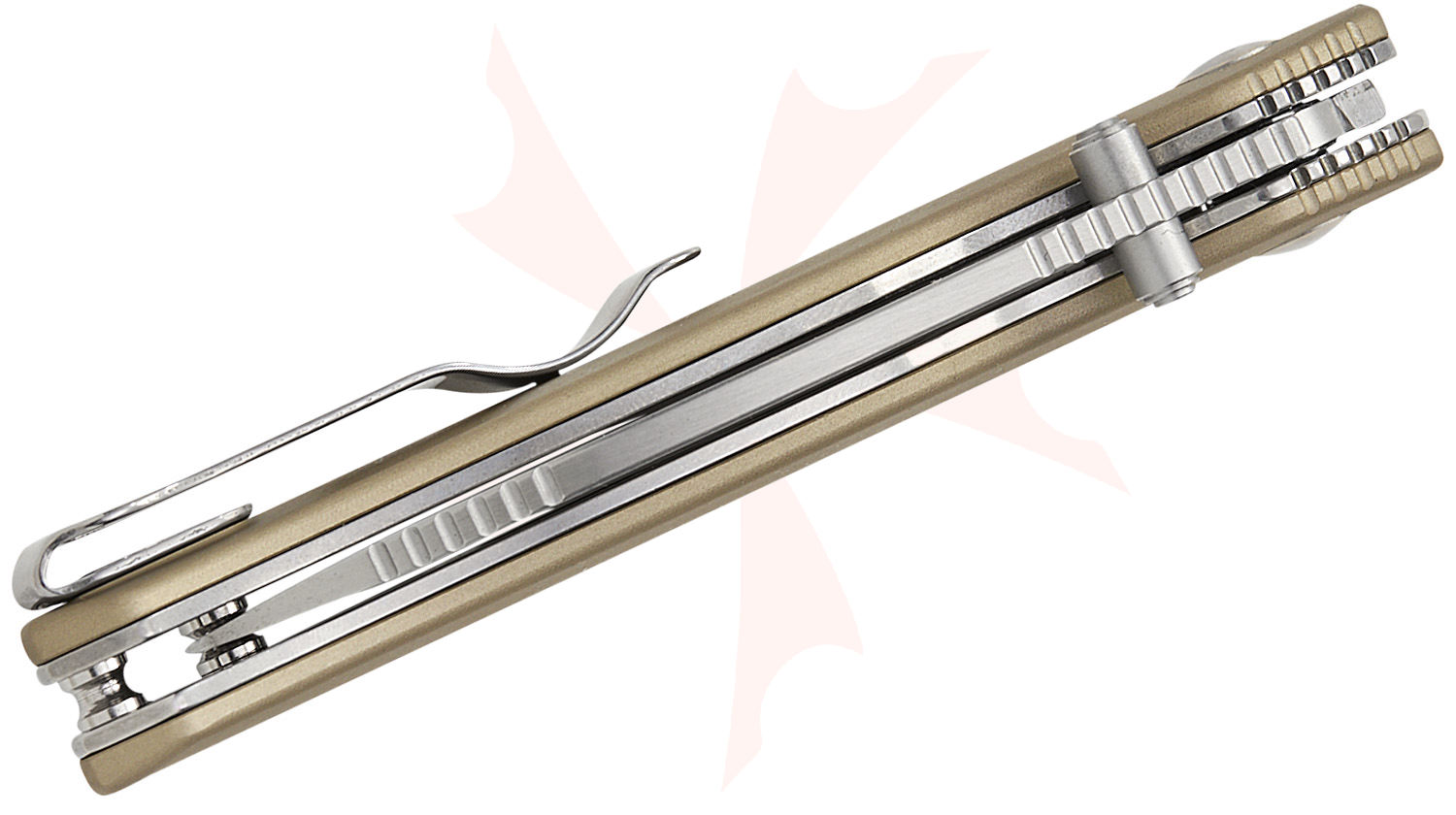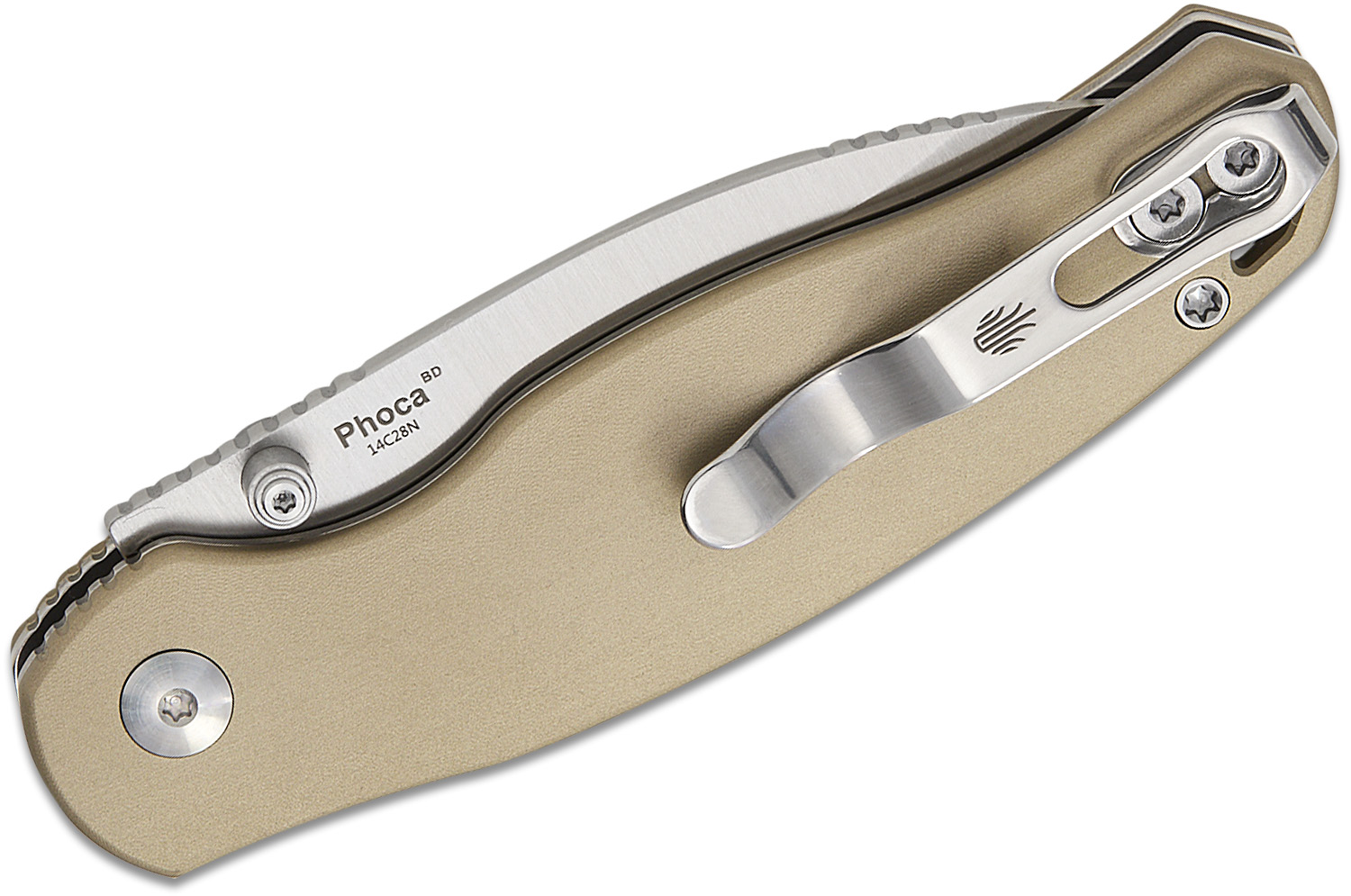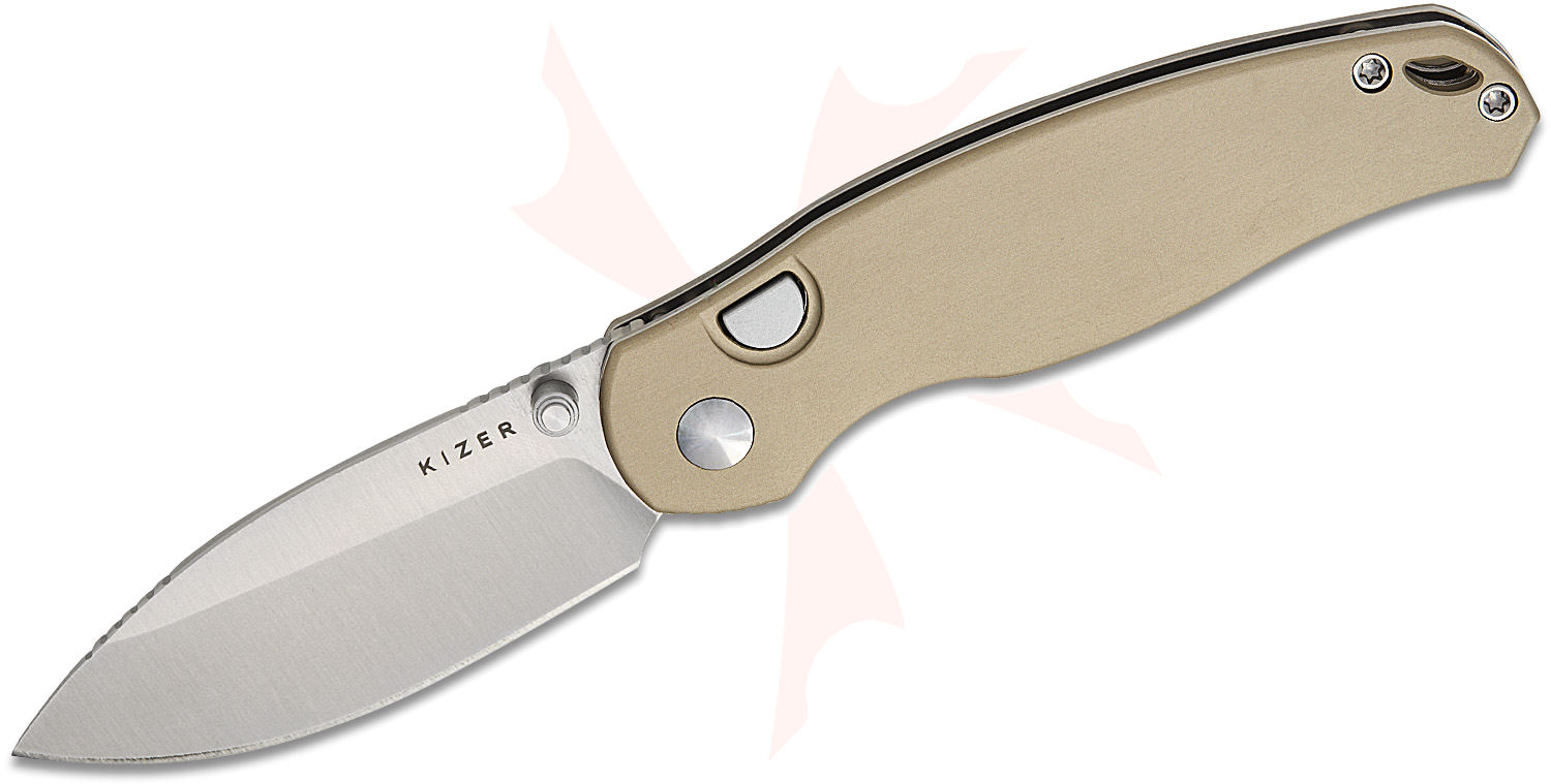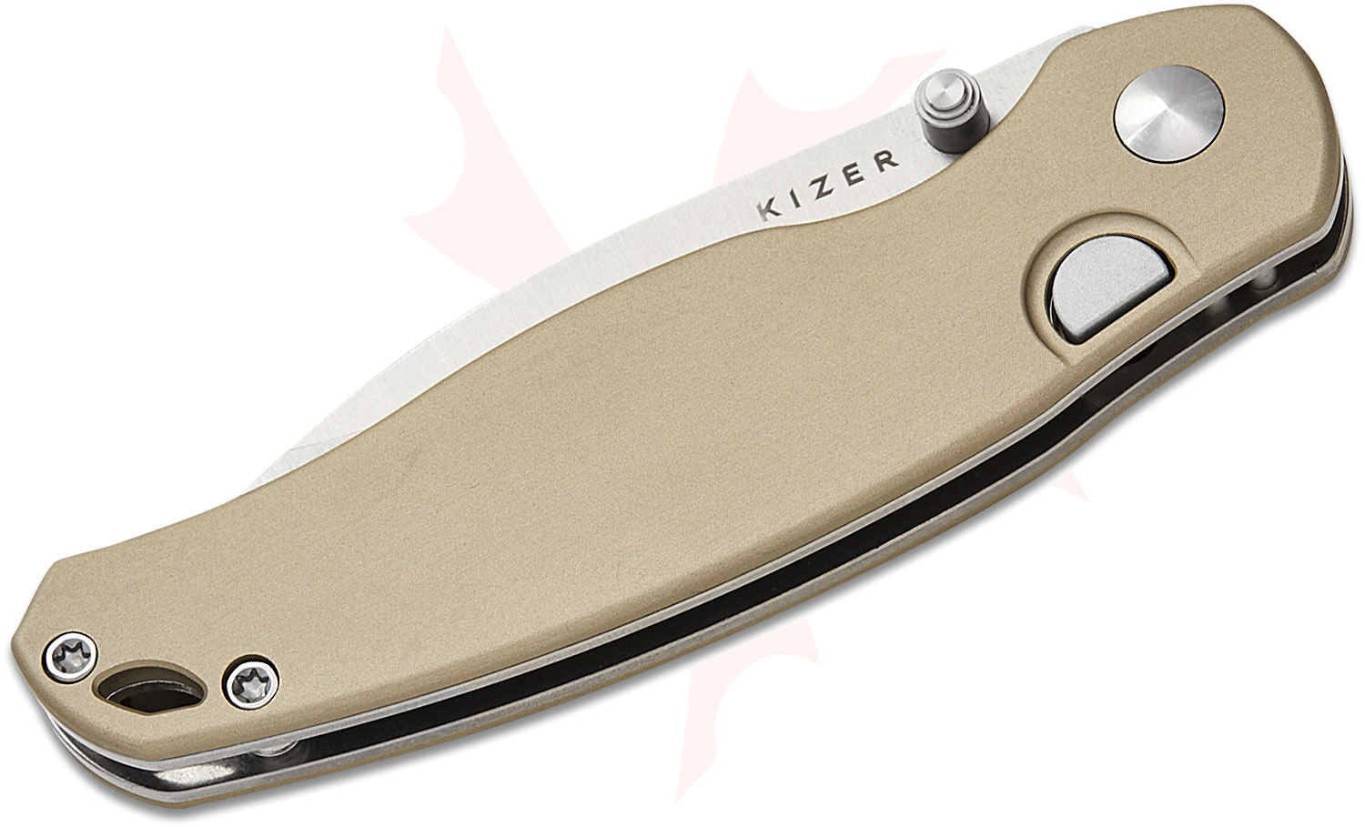 Kizer Cutlery Vanguard Phoca BD Button Liner Lock Folding Knife 2.95" 14C28N Satin Drop Point Blade, Sand Aluminum Handles, Deep Carry Clip - V3781BDA2